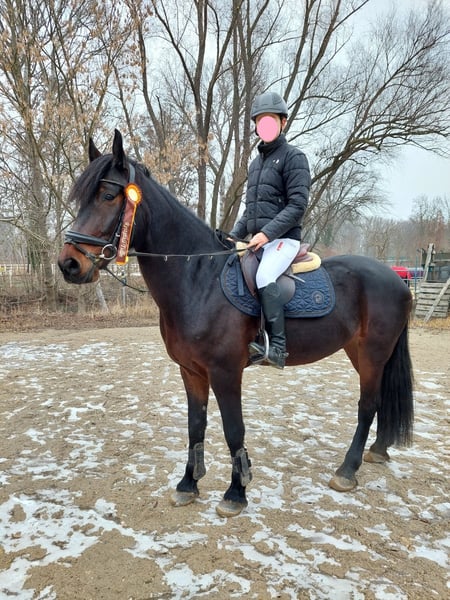 Nous vendons notre hongre de 5 ans, mesurant un peu plus de 1,60 m (cheval de sport hongrois), qui est monté par ma fille (15 ans) depuis presque un an. En dressage, il est à un bon niveau A, et il participe très motivé à l'entraînement de saut d'obstacles. L'entraînement au saut a commencé il y a deux mois, et il saute actuellement environ 80 cm. Lors des sorties en groupe, il se montre détendu et n'est pas effrayé. En main, il se comporte de manière équilibrée et reste calmement au box de pansage, cependant, en raison de son âge, il n'est pas adapté aux cavaliers totalement débutants. Chez le maréchal-ferrant, il se montre très sage. Il connaît le box ouvert et le box avec sortie au paddock, et il a toujours été compatible avec d'autres chevaux jusqu'à présent. Un examen vétérinaire avec des radiographies (sans constat) de l'année dernière est disponible. Pour plus d'informations et des vidéos, n'hésitez pas à demander. Pour l'essai, un montant de 20 EUR est à régler, qui sera déduit du prix d'achat en cas d'achat.