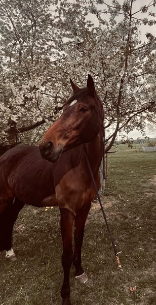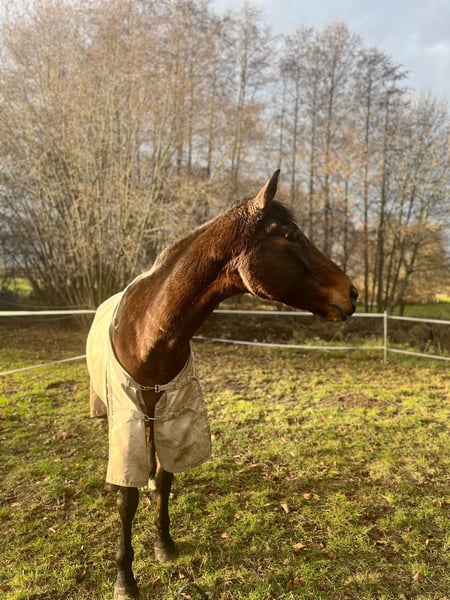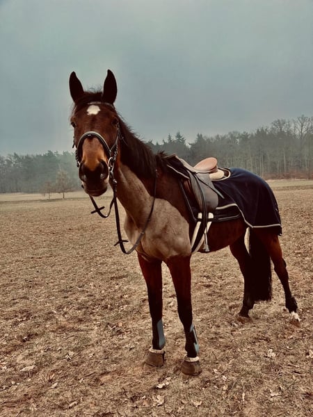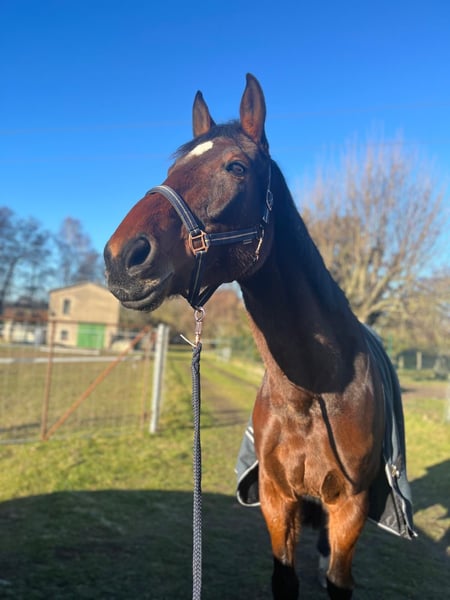 Hello, It is with a heavy heart that I must sell my 10-year-old mare, Astoria, due to lack of time. About her: Astoria is a somewhat complicated and not perfect horse; she has many flaws (she suffered a suspensory ligament injury two years ago), but once she trusts you, she is an absolute angel. She will stand by you through thick and thin if she feels secure. Whether in the field or in the arena, she is very loyal. She finds it a bit difficult to maintain consistent contact because her previous suspensory ligament injury causes her to lean on her front leg and not work properly from behind. However, with a lot of patience and work, we made significant progress over the summer, including improving her contact and even jumping a few small fences. I rescued her from a difficult situation, which is why it is very important to me that she goes to people who speak softly and handle her gently. She gains trust through compassion and calmness. I want someone to appreciate her for who she is, even if she’s not perfect. It is also very important to me that I stay in contact with her new owners to hear how she is doing in her new home. Currently, she is kept in a box stall, which I also wish for her future. She thrives best in this environment. She is neither a competitive nor a sport horse. I envision her having a relaxed, stress-free life to prevent her suspensory injury from recurring. Since she is still relatively young, everything can be rebuilt slowly and patiently. She loves jumping, but she needs a lot of trust and security in this activity as well. If you can offer her a calm, loving, and patient home, please feel free to contact me. A trial ride is possible for €15, which will be deducted from the purchase price if she is sold.