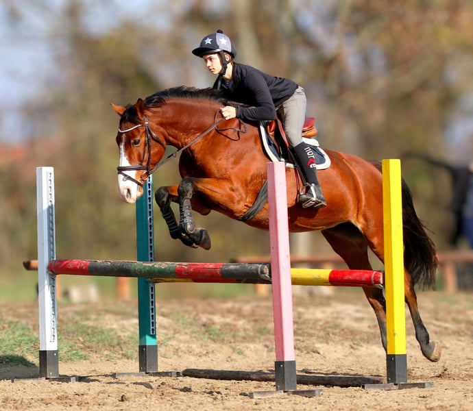 Hungarian Sport Horse, Bj. 2011, mit exzellentem Pedigree. Sie ist vollständig gesund, hatte niemals gesundheitliche Probleme und hat alle notwendigen Impfungen. Röntgenbilder sind verfügbar, bei ernsthaftem Interesse wird eine aktuelle medizinische Untersuchung durchgeführt. 162 cm mit Stock, sehr freundlich, leicht zu transportieren und zu handhaben. Regelmäßige Teilnehmerin an Springwettbewerben, bis 110 cm. Letztes Jahr wurde sie Zweite in der 'Advanced Large Horse Category' bei der Pony Club National Championship. Ich empfehle sie für erfahrene Amateure und jeden, der sich entwickeln und lernen möchte. Sie lebt in Ungarn, nahe Budapest. Weitere Fotos und Videos senden wir auf Anfrage.