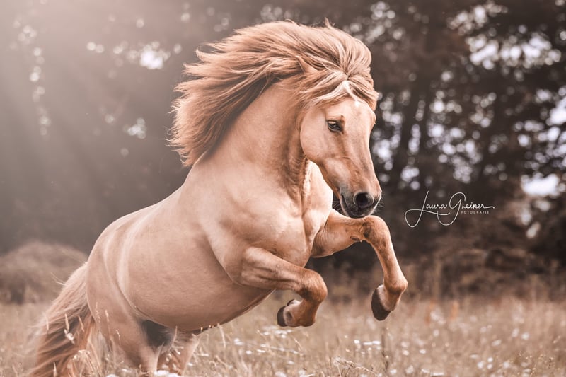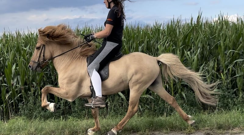 Super schicker Allrounder mit extrem viel Potenzial für den hohen Sport Máni frá Hrafnkelsstödum IS2012136873 Máni ist ein super schicker 1,42m großer Galsi-Enkel, 5-Gänger in schicker Sonderfarbe: Fuchsfalbe mit Stern. Er war bis Ende 2024 Hengst und hat 20 tolle Nachkommen (darunter auch einige Elite Fohlen). Máni ist ein absoluter Allrounder wie er im Bilderbuch steht: - er springt über 1,30m - Futurity Viergang (5-jährig): 6,9 Punkte - FIZO alle Gänge 8,0 (als Viergänger vorgestellt) - er liebt es am langen Zügel durch den Wald zu tölten - immer regulierbar (kein Anfängerpferd!) Máni kann ohne Probleme, sowohl vorne als auch hinten im Gelände laufen. Er kennt sämtliche Dressurlektionen und steht sehr leicht an den Hilfen. Durch meine Schwangerschaft bin ich leider zu schwer für ihn geworden und letztendlich war er immer etwas zu klein für mich (ich bin ca 1,90m). Ich kann mir Máni sehr gut für einen gut reitenden Jugendlichen/ Junioren vorstellen, der noch einige Preise auf dem Turnier holen möchte oder vor hat mal bei der DJIM teilnehmen zu wollen. Seine Bestpunktzahl liegt bei 7,0 im Tölt, Galopp und Trab, und bei 6,5 für Schritt. Er war auch schon mal F1 qualifiziert, allerdings ist der Pass manchmal etwas viertaktig, daher sehe ich sein Potenzial eher in der V1 und T1. Aber auch als Luxusfreizeitpferd wäre er perfekt. Máni hat gutes Temperament, ist immer fleißig und liebt es bewegt/ gearbeitet zu werden. Máni ist regelmäßig (fürs Turnier) geimpft, entwurmt, dem Hufschmied, Osteo und Zahnarzt vorgestellt worden. Er ist aktuell untrainiert, da ich schwanger war. Trainiert steigt der Preis Standort: 49832 Thuine