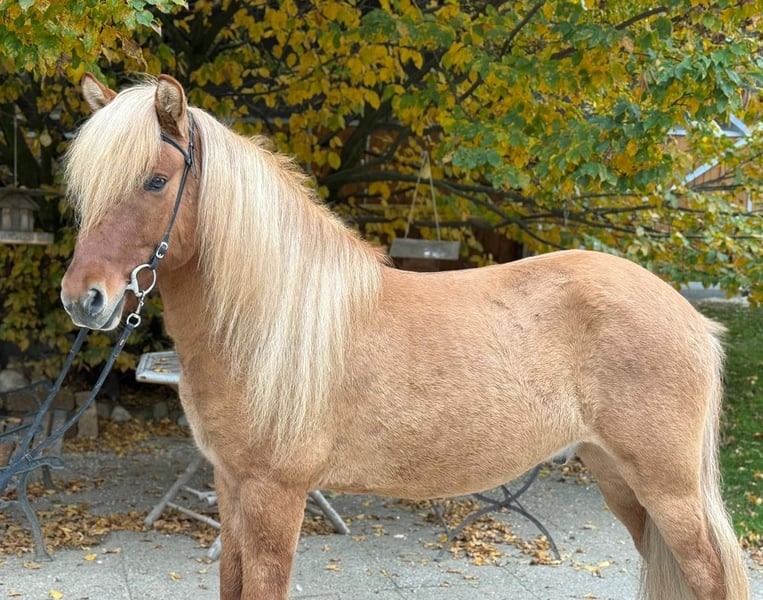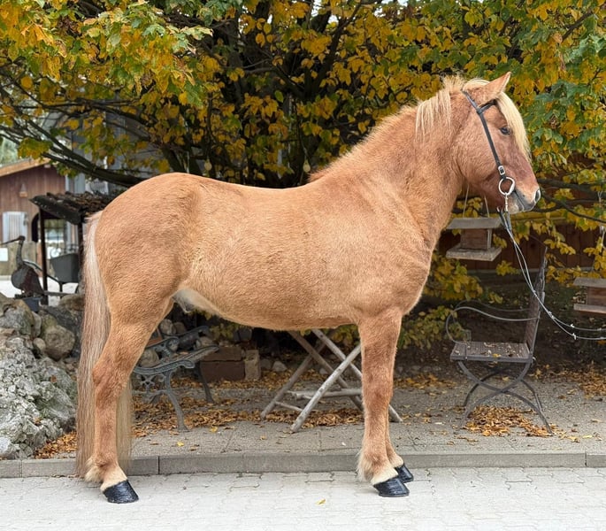 Kjartan vom Solhof Wallach, 140 cm groß *2020 in Österreich Viergänger direkt vom Züchter geimpft, beschlagen und entwurmt✅ V: Eldfari frá Laugabóli 7,99 (Ext 8,06 Re 7,95) VV: Borgar frá Strandarhjáleigu 8,44 (Ext 8,39 Re 8,47)‼️ M: Karólina frá Lambeyrum MV: Sær frá Bakkakoti 8,62 (Ext 7,96 Re 9,05) ‼️ Dieser außergewöhnlich hübsche Wallach verzaubert mit seiner Barbiepferd-Optik: eine harmonische Erscheinung und Ausstrahlung kombiniert mit dieser wunderschönen Fuchsfalbfarbe macht ihn zu einem echten Blickfang. Wir haben bereits seinen Vater Eldfari verkauft und wer diesen kennt, wird sofort die Ähnlichkeit sehen – Charakter, Gangwerk und Ausstrahlung machen ihn zu einem wahren Ebenbild. Nun dürfen wir auch für seinen wunderschönen Sohn „Kjartan“ ein liebevolles Zuhause suchen. Er wurde schonend angeritten und mit viel Geduld ausgebildet. Schon jetzt überzeugt er mit einem klaren Kopf, Gelassenheit und Neugier, ganz gleich ob in vertrauter Umgebung oder in neuen Situationen. Kjartan besitzt ein angenehmes Temperament – aufmerksam und fein, dabei stets kontrollierbar und gelassen. Er reagiert wunderbar auf Stimme und Hilfen, ohne je überempfindlich zu sein. Ein einfaches Zungenschnalzen reicht für mehr Tempo, ein sanftes hooo für die Bremse – so fein kann Kommunikation sein. Besonders hervorzuheben ist sein raumgreifender und schreitender Schritt, der einen nur staunen lässt. Ein taktklarer, schwungvoller Trab, der Freude macht und sein bequemer, schön gesprungener Galopp zaubert jedem ein Lächeln ins Gesicht. Im Tölt zeigt er bereits vielversprechende Ansätze – hier braucht es nur noch Übung und „ein paar Kilometer“, wie wir liebevoll sagen. Im Sattel vermittelt er seinem Reiter stets ein sicheres, vertrautes Gefühl, als würde man auf einem alten Hasen sitzen – obwohl er noch jung ist. Halle, Viereck, Ovalbahn oder Gelände – er kennt alles und zeigt sich überall cool, souverän und mit viel Herz. Ob für entspannte Ausritte nach einem langen Tag, gemeinsames Lernen in Kursen oder einfach Freude an einem vielseitigen, charmanten Partner – dieser Wallach ist bereit, das Herz seines Menschen zu erobern. Aktueller Preisrahmen liegt zwischen 15.000 und 18.000 Euro - steigt mit weiterem Training. Kjartan kann nach Absprache jederzeit bei uns in A-5221 Lochen am See kennengelernt und probiert werden.
