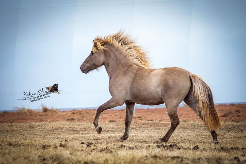 Vitnir - geboren 2020, Wallach, Mausgraufalbe mit Windfarben, ca. 135cm M: Vinka vom Sommerberg V: Eldur von den Amperauen (Bilder von Eltern ganz am Ende) Sehr schöner Islandwallach mit besonderer Farbe und tollem Charakter sucht seinen Menschen für immer. Vitnir ist 5 gängig veranlagt, hat einen guten Trab, Galopp und hat viel flüssigen Tölt. (wenig Pass). Alle Gangarten sind sehr angenehm zu sitzen und zu reiten. Er braucht natürlich noch weitere Ausbildung um alle Gangarten zu stabilisieren. Mit guter Reiterfahrung und Unterstützung mit Reitstunden sollte ausreichend sein, um ihn weiter auszubilden. Er war 2 Monate (Februar/März) in Beritt auf Hof Ruwerbach und ansonsten habe ihn bisher selbst ausgebildet. Über Sommer waren wir nur im Wald reiten und erst im Winter wieder in der Halle. Er lernt sehr schnell und ist immer freundlich, auch wenn man ihn herausfordert. Er kennt natürlich auch longieren und Doppellonge und geht als Handpferd mit. Er lässt sich brav von Kindern reiten, auch ohne Sattel und genießt es geputzt und betüdelt zu werden. Bisher läuft er barhuf und wird im Gelände mit Hufschuhen geritten. Hufpflege kennt er und ist brav. Vitnir ist ein toller Freizeitpartner für gemeinsame lange Ausritte oder Spaziergänge, in Halle und Ovalbahn ist er auch sehr gut reitbar. Er kann gerne angeschaut und probegeritten werden. Im Umgang ist er sehr lieb und höflich. Er ist in der Wallachherde sehr gut verträglich und kennt auch gemischte Herden. Ich habe ihn selbst von meiner Stute gezogen, somit ist er seit Fohlen bei mir. Er ist in einer Hengstherde groß geworden und wird seit Anfang 2025 geritten. Seine Mama kann auch bei mir angeschaut werden. Er war bisher stets gesund und ist regelmäßig entwurmt und geimpft. Ich suche für ihn eine tolles Zuhause und einen tollen Menschen. Es soll ein Platz für immer sein. Er wird nur abgegeben, wenn alles sehr gut passt. Platz vor Preis. Bitte nur seriöse Anfragen. Videos auf Anfrage.