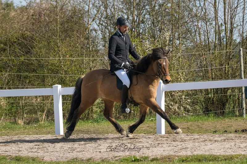 Bolmur is een zeer grote, sterke en uitermate vriendelijke natuurgetolte ruin met veel uitstraling en présence. Zijn comfortabele, altijd taktvaste tölt is zeer prettig om te zitten en blijft ook bij losse teugel betrouwbaar in het ritme. Hij beschikt over een goed temperament met een mooie voorwaartse drang, blijft echter altijd goed te reguleren en aangenaam om te rijden. Door zijn mensgerichte en evenwichtige aard is hij zowel in de dagelijkse omgang als onder het zadel een zeer plezierige partner. Verzorgingsstaat: Bolmur verkeert in een zeer goede conditie qua verzorging en voeding. Hij is eczeemvrij en komt uit een eczeemvrije ouderlijn. Uiterlijk: Bolmur is een zeer groot gebouwd, langbenig en krachtig ruin met een stevige basis en goede musculatuur. Hij beschikt over een goede bovenlijn, een krachtige achterhand en door zijn grootte en bouw ook zeer geschikt voor grotere en sterkere ruiters. Karakter: Bolmur is een zeer mensgericht paard met een vriendelijke en coöperatieve aard. Hij zoekt contact zonder opdringerig te zijn en toont zich in de omgang rustig, betrouwbaar en helder van geest. Onder het zadel beschikt hij over een goed temperament met een aangename voorwaartse drang, die altijd zeer goed te reguleren blijft. Hij is alert, wil graag gefallen en werkt gemotiveerd mee, zonder hectisch of overgevoelig te worden. Gangen: Bolmur is viergangig gereden en een natuurgetolte met veel taktvaste, comfortabele tölt, een zogenaamde "naaimachinetölt", zoals men dat mooi noemt. De tölt is tot een middelmatig tempo zeker te hervatten en blijft ook bij losse teugel betrouwbaar in het ritme. Draf en galop zijn goed te reguleren met een mooie tempovariatie en goede balans. Door zijn bewegingskwaliteit en goed temperament is hij ook voor de sport interessant bij verdere opleiding. Opleidingsniveau: De basisopleiding van Bolmur is afgerond. Hij kan op de rijbaan, in de hal en in het terrein zowel solo als in een groep gereden worden en toont zich daarbij zeker en betrouwbaar. Bolmur loopt mooi aan de teugel, reageert goed op de hulpteugels en is prettig te reguleren. Zijgangen in basisvorm, zoals schouder- en flankdriegangen, evenals achterwaarts gaan, zijn hem bekend en worden zeker uitgevoerd. Vooral in de tölt toont hij zich soepel in de hals, goed doorlatend en altijd taktvaste, wat hem een zeer comfortabel rijgevoel geeft. Wie past bij mij: Bolmur is een ideaal paard voor ruiters die op zoek zijn naar een grote, sterke en comfortabele natuurgetolte met goed te reguleren temperament. Hij is geschikt voor gevorderde recreatieve ruiters, maar ook voor herintreders en ambitieuze beginners. Door zijn grootte en stevige fundament biedt hij ook grote of sterkere ruiters voldoende ondersteuning. Dankzij zijn goede rijbaarheid, helder hoofd en degelijke basisopleiding is hij veelzijdig inzetbaar en bij verdere ontwikkeling ook interessant voor de sport. Vader: De vader van Bolmur, de beroemde Hjalti, staat bekend om zijn ongelooflijke gangkwaliteit, vooral in de basisgangen, gecombineerd met een sterk, prestatiegericht karakter. Hjalti-nakomelingen zijn grote, langbenige paarden met duidelijke gangonderscheidingen, die vloeiend tussen draf en tölt kunnen wisselen en een koele, stressvrije aard hebben zonder saai te zijn. Van zijn talrijke succesvolle nakomelingen wordt hier slechts de wereldkampioen 2017 in de V2, "Glæsir von Gut Wertheim", genoemd. Moeder: Moeder Björk is een grote, krachtige merrie met een aansprekend bouw. Vooral haar lange, dichte manen springen in het oog, waardoor Björks vrouwelijke hoofd nog meer tot uiting komt. Al op jonge leeftijd werd Björk bereden en FEIF-gekeurd. Björk beschikt over een zeer gemakkelijk te rijden tölt, die tot hoge tempos altijd taktvaste is. Tölt is Björks favoriete gang. Ze geeft haar nakomelingen, naast de taktvaste goede tölt, veel expressie en een grote, oplettende oog. Overige: Naast Bolmur hebben wij nog veel meer paarden te koop. Neem gerust contact met ons op voor een kennismaking, samen vinden we het juiste paard voor jou! Een proefrit is na afspraak mogelijk, hiervoor rekenen wij €65.