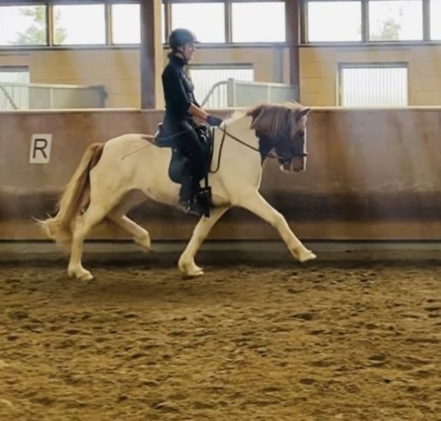 Flekkur ist ein toller fünfgägiger Wallach, mit ganz viel Naturtölt, aber auch sein außergewöhnlicher Trab ist nicht außer acht zu lassen. Er ist ein aufgeschlossener und positiver Wallach, der letzten Sommer seine Karriere als Reitpferd begonnen hat. Er zeigt sich unter dem Reiter fleißig und vertrauensvoll mit feinen Reaktionen und allen Gängen. Er geht brav ins Gelände in der Gruppe, sowie auch alleine. Aufgrund seines etwas schmaleren Gebäudes, könnten wir ihn uns gut für einen ambitionierten Jugendlichen vorstellen, der sich zusammen mit seinem Pferd weiterentwickeln möchte. Sein Großvater ist Glitnir frá Eikarbrekku (FIZO 8,48).