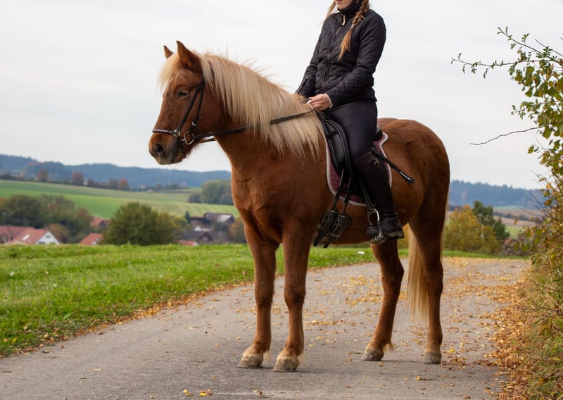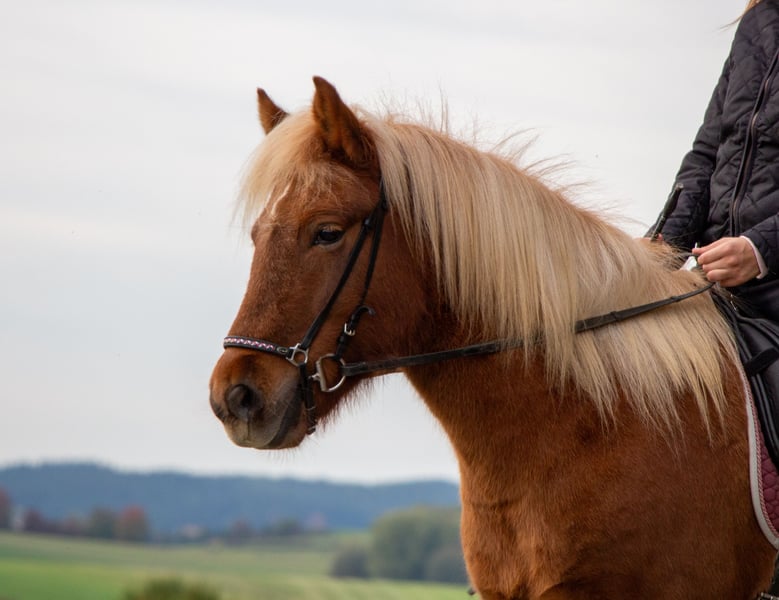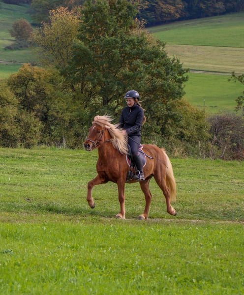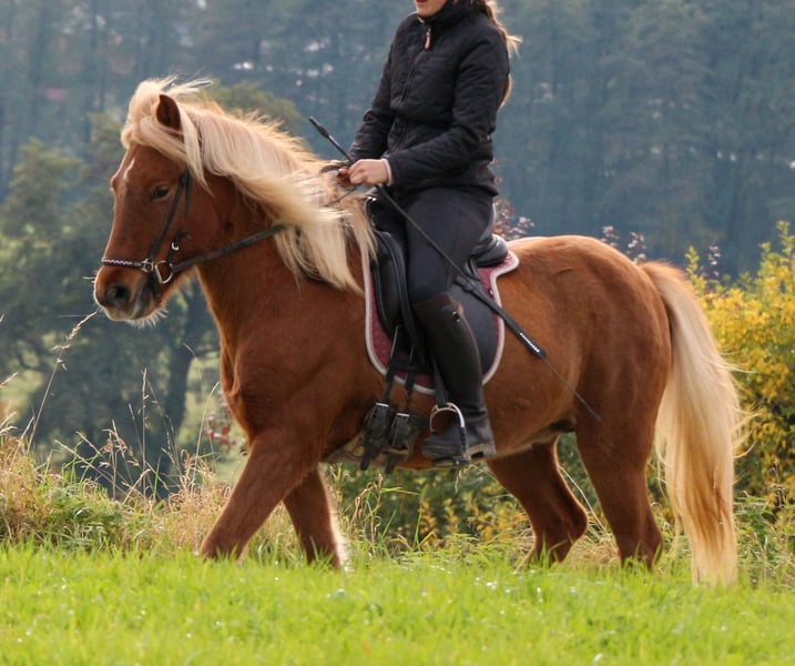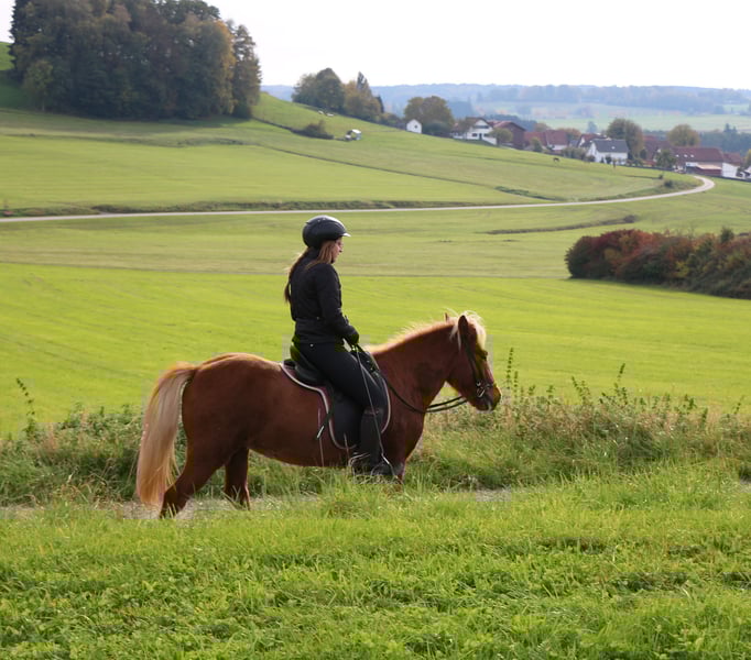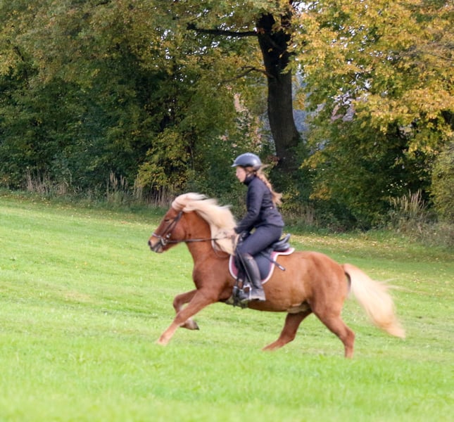 Zum Verkauf steht die 4,5 jährige, 5gängige Islandstute Maistjarna. Sie ist deutsch gezogen. Mit ihrem stimmigen, stabilen Gebäude, einer tollen Oberlinie und ihrer wunderschönen Farbe, ist sie ein echter Hinkucker. Auch ihr Charakter ist eine 12/10! Körperlich ist sie nicht die Größte, fühlt sich aber an wie ein "richtiges Pferd". Ich schätze sie auf ca. 1,37m, wobei sie aktuell noch wächst! Stabil gebaut! In der Herde ist sie absolut unkompliziert und eher rangniedrig. V: Krani frá Hofi Sie ist erst seit kurzem (Ende August) unter dem Sattel und begeistert seit dem 1. Training mit ihrer unkomplizierten, lerwilligen Arbeitseinstellung. Die Stute wird auf dem Platz und im Gelände (auch alleine!) aktuell 4gängig geritten. Die Gänge sind problemlos abrufbar Sie zeigt sich gut ausbalanciert, mit viel Takt und Fluss in allen Gangarten. Ein absolutes Sofa! Besonders viel Freude bereitet ihr endloser Tölt. Diesen zeigt sie, trotz der sehr kurzen Zeit unter dem Sattel, bereits problemlos am losen Zügel (siehe Bilder). Maistjarna verfügt über mittleres Temperament, will immer gefallen und ist absolut kopfklar! Auch für schwächere Reiter geeignet. Geht brav mit Kindern an der Longe oder Spazieren. Aktuell ist sie UNBESCHLAGEN und zeigt bereits, dass da noch ganz viel Luft nach oben ist! Wir konnten hier keinerlei Unarten festellen. Maistjarna zeigt keine Anzeichen von Ekzem. Sie ist Tetanus und Influenza geimpft Sie lernt alles kennen was ein junges Pferd kennen muss : -Verladen -Ausschneiden -Kühe -Schafe -Hunde -Kinder -Longieren -Handpferdereiten -Stangen -Doppellonge Maistjarna hat ein Herz aus Gold und verdient ein 5****Zuhause! Ob für die Zucht (hatte bereits 1 Fohlen), Turnier oder einfach endloses Durch-den-Wald-tölten, Maistjarna deckt alles ab! Wer einen kopfklaren Allrounder mit viel Herz sucht, ist hier genau richtig. Vorbei kommen und verlieben! Ich wünsche mir für sie ein gutes Zuhause, in dem sie geschätzt wird! Bei weiterer Ausbildung steigt der Preis.