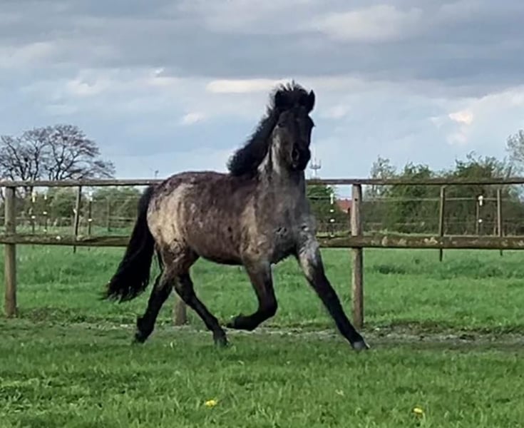 Jeune jument très talentueuse Petite-fille d'Áugustinus en robe spéciale Jeune jument de 2 ans très intéressante avec des mouvements très amples. En liberté, elle présente les cinq allures de manière pétillante, élastique et avec une grande variation de vitesse.