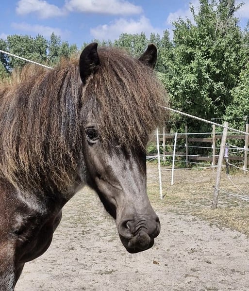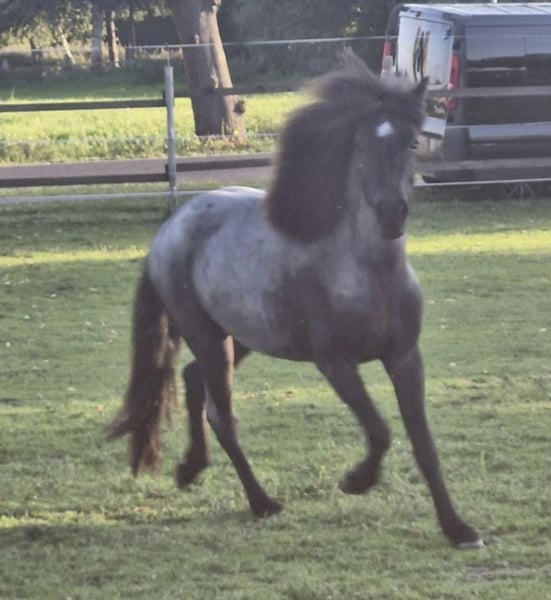 Stella van Godafoss – een prachtige, jonge IJslandse merrie met een bijzondere kleur – een echte blikvanger in zeldzaam voskleur (Blue Roan). Geboren in 2022 en met een geschat eindhoogte van ongeveer 140 cm, beschikt ze niet alleen over een mooie uitstraling, maar ook over een gezonde bouw, goede gezondheid (zonder zomereczeem) en een geweldig karakter. Ze is volledig verzorgd, regelmatig door de dierenarts gecontroleerd, ontwormd en gevaccineerd. Stella is schoeisel- en trailer-proof, en braaf bij de dierenarts – dagelijks omgang is voor haar vanzelfsprekend. Ze is opgegroeid in een open stal in een merrie- groep met veel sociaal contact, en toont zich goed gesocialiseerd, evenwichtig en vriendelijk in de omgang met andere paarden. Haar liefdevolle, open karakter is bijzonder te noemen. Stella is mensgericht, makkelijk in de omgang, nieuwsgierig en leergierig – een echt betrouwbaar paard in ontwikkeling. Ze groeit op met kinderen, benadert hen empathisch en geduldig, en gaat al als handpaard betrouwbaar mee de buitenritten in. Ook tijdens wandelingen met kinderen blijft ze kalm en alert. Bit en longeerwerk kent ze ook, maar is op leeftijd passend rustig opgebouwd en heeft zich zowel lichamelijk als mentaal kunnen ontwikkelen. Met haar goede basisgangen en haar evenwichtige aard is Stella een ideale partner voor recreatieve en buitenritten, voor ruiters die een stoer jonge paard zoeken met duidelijke aanleg tot zelfontwikkeling. Ze wordt afgeleverd met paardenpaspoort en stamboekbewijs, in liefdevolle en stimulerende handen – klaar voor haar volgende stappen en vol potentieel voor een gezamenlijke toekomst.