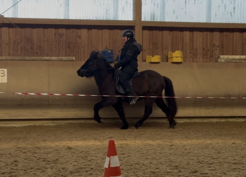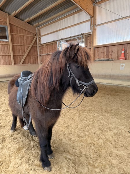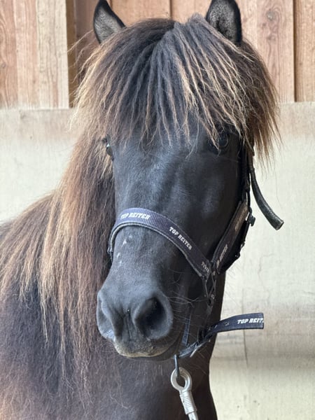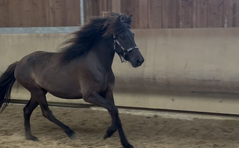 Karma von Möllenbronn ist eine 4 jährige deutlich fünfgängig veranlagte eher kleine Stute. Ihre Mutter ist eine Vidalin frá Hamraholi Tochter. Ihr Vater ist ein 145cm großer sehr talentierter, viergängig veranlagter Aron Sohn. Karma selbst zeigt freilaufend viel taktklaren Tölt bei gutem Fluss und schönem Raumgriff. Karma wird aktuell schonend angeritten und kennt bereits den Sattel, Trense und den Reiter. Sie wird zurzeit schon frei in der Halle im Tölt, Schritt und Galopp geritten. Karma wird günstig aufgrund von Asthma abgegeben. Sie benötigt Heulage, Heu verträgt sie nicht. Bei uns steht sie zusätzlich immer wieder im Soleanhänger.