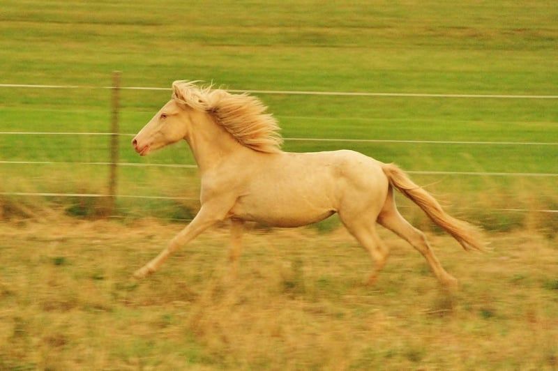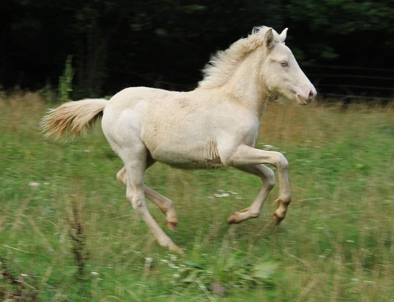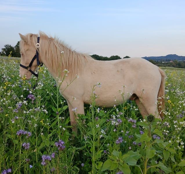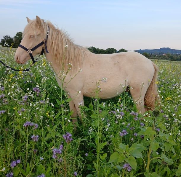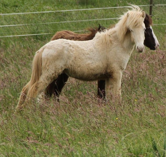 Fagurfifill aktuell einzigartiger einmal vergebener Name trifft ein genauso besonderes Pferd. Weiß mit blauen Augen als Farbgarant geboren durch seine Reinerbigkeit auf das Cremegen wurde er als Perlino getestet. Zusätzlich hat er von seinem Vater das Schimmelgen geerbt, ist also mischerbig Schimmel. Das Schimmelgen hat auf seine eigene Farbe keine farbverändernde Auswirkung da er eh schon weiß durch Doppelcreme ist. Fagurfifill selbst könnte bei Zuchteinsatz nur Erdfarbene, Smokey Black und Isabellfarbene Nachkommen zeugen, diese mit 50 % Chance auf Schimmelgen. Seine gute Abstammung macht ihn in Kombination mit seinem Charakter und Gang für alle Sparten interessant. Es finden sich bei ihm hoch geprüfte Pferde wie der Álfur frá Selfossi Sohn Þórálfur frá Prestsbæ. Den Krákur frá Blesastöðum 1A Sohn Þorlákur frá Prestsbæ und Skjanni fra Nyjabae,Sohn des Hróður frá Refsstöðum. Wie auch den bekannten Klettur frá Hvammi. Sein Stammbaum ist bis einschließlich den Urgroßeltern vollständig DNA bestätigt, erst dannach gibt es DNA-Lücken da nicht von allen Pferden DNA vorliegt. Charakterlich ist er ein absoluter Schatz, von Geburt an am Mensch orientiert, mit angeborenem Vertrauen und immer freundlich und interessiert. Er begegnet den meisten Situationen recht gelassen und kennt auch schon sehr viele Umweltfaktoren durch seine bisherige Haltung. Vom Temperament zeigt er sich bis dato sehr ausgeglichen mit klarem Kopf und guter Lauffreude und Kooperationswillen. Er kennt das Fohlen ABC wie auch die regelmäßige Hufpflege und ist dabei bis dato Hufpflegefromm. Auch ist er es gewöhnt von Fohlen an Verladen und im Pferdeanhänger zum Weideumtrieb gefahren zu werden und dadurch Verladefromm. Seit Geburt ist Fagurfifill gesund, unverletzt, Ekzemfrei, regelmäßig entwurmt und wurde Grundimmunisiert auf Tetanus und Influenca. Er ist es gewöhnt täglich Zusatzfutter mit Lexa Juniormineral zu erhalten. Für seine 1,5 Jahre bringt er eine gute Größe mit, was ein Endmaß um die 140 stm erhoffen lässt. Von Geburt an war er eher Kräftig im Fundament mit langen Beinen und guter Hals Rücken Proportion. Mit Blick auf seine Eltern sollte er später ein stabiles Fundament mit etwas sportlichem Gebäude haben. Aktuell mitten in der Entwicklung sollte jedem klar sein das er auch mal nicht ganz so schön und Proportional aussieht wie es eben bei vielen Jungpferden oft der Fall ist. Von seiner Mutter scheint er die mega lange Mähne geerbt zu haben, da sie mittlerweile noch ein gutes Stück länger ist als auf den Fotos im Blumenfeld von Spätherbst. Fagurfifill ist Fünfgangveranlagt mit ausgeprägten guten Grundgängen. Sein Schritt sauber vorhanden, die ersten Wochen nach Geburt hat er fast ausschließlich Tölt gezeigt und zeitweilig auch Pass. Seitdem er den Trab gefunden hat zeigt er diesen sicher, raumgreifend mit viel Schub und Tempofähigkeit. Je nach Tagesform ist der Tölt immer wieder mindestens in den Übergängen und mehr sichtbar. Sein Galopp ist für einen Fünfgänger gut ausgeprägt mit oft Bergauftendenz versehen. Ganglich bringt er viel Potential mit und wäre nicht nur ein zukünftiges gehobenes Freizeitpferd sondern bietet auch die Option auf Sport und Zucht. Fagurfifill kann auf Wunsch gegen Kostenerstattung noch bei mir Kastriert werden und nach Abheilung dann erst ins neue Zuhause umziehen. Beide Hoden sind abgestiegen vorhanden. Aktuell ist er recht plüschig, er kann gerne persönlich kennengelernt werden. Die Fotos sind von Fohlen bis Winteranfang 25. Es gibt lediglich nur das Fohlenvideo, weitere Videos sind derzeit organisatorisch und Platztechnisch nicht machbar. Bei echtem Interesse freue ich mich auf Nachricht. Ratenzahlung ist möglich solange er bei mir stehen bleibt, anfallende Versorgungskosten sind in dieser Zeit zusätzlich zu entrichten. Eine Aku kann gerne vom Wunschtierarzt durchgeführt werden.