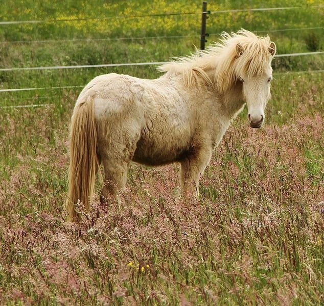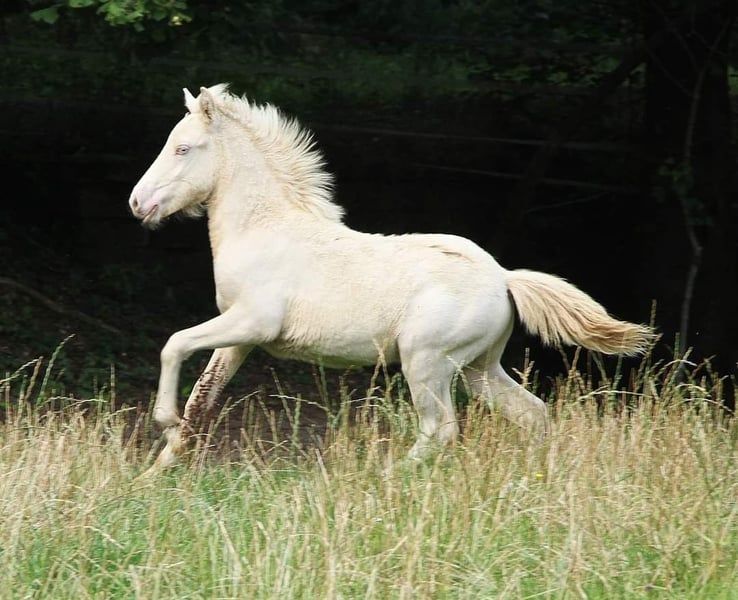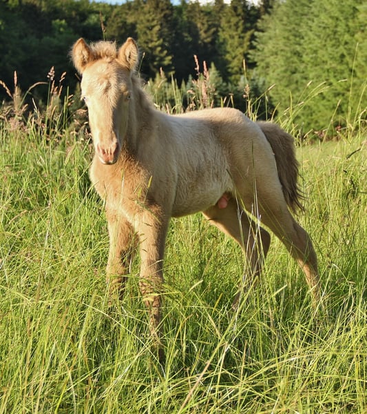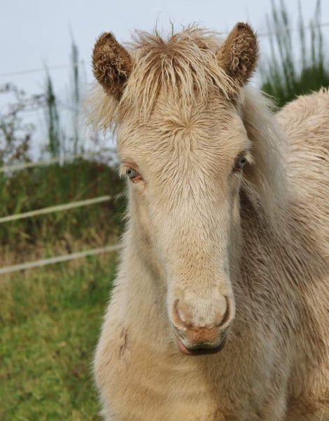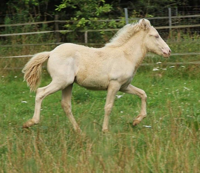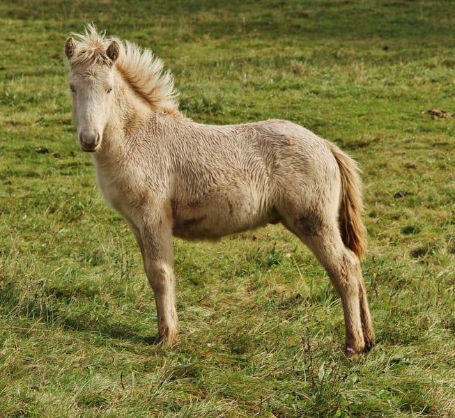Fagurfifill is currently a unique name, awarded only once, and perfectly matches an equally special horse. Born with a white coat and blue eyes, as a guarantee of color, he was tested as a Perlino due to his purebred heritage on the Cremegen. Additionally, he inherited the grey gene from his father, making him a heterozygous grey. The grey gene has no effect on his color since he is already white through double cream. Fagurfifill could only produce offspring with earth tones, Smokey Black, or Isabelline, with a 50% chance of passing on the grey gene. His excellent pedigree, combined with his temperament and gait, makes him interesting for all disciplines. His lineage includes highly tested horses such as Þórálfur frá Prestsbæ, son of Álfur frá Selfossi; Þorlákur frá Prestsbæ, son of Krákur frá Blesastöðum 1A; and Skjanni frá Nyjabae, son of Hróður frá Refsstöðum. Also among his ancestors is the well-known Klettur frá Hvammi. His pedigree is fully DNA-verified up to his great-grandparents; beyond that, there are some gaps where DNA data is missing for certain horses. In terms of character, he is an absolute treasure, naturally oriented towards humans from birth, with innate trust, always friendly and curious. He approaches most situations quite calmly and has already experienced many environmental factors through his previous handling. His temperament is currently very balanced, with a clear mind, good movement, and willingness to cooperate. He is familiar with basic foal handling, including hoof care, and has been hoof care-free so far. He is accustomed to being loaded onto a trailer from a young age and transported to pastures, making him confident with loading. Since birth, Fagurfifill has been healthy, uninjured, eczema-free, regularly dewormed, and vaccinated against tetanus and influenza. He is used to receiving daily supplements with Lexa Juniormineral. At 1.5 years old, he already has a good size, promising an eventual height of around 14.0 hh. From birth, he has had a sturdy build, with long legs and a good neck-back proportion. Based on his parents, he should develop a solid foundation with a slightly sporty build. Currently in the middle of development, it should be clear that he may not always look perfectly proportional, which is common in many young horses. He seems to have inherited his mother’s impressive long mane, which is now even longer than in the photos taken in the flower field in late autumn. Fagurfifill is five-gaited with well-developed basic gaits. His walk is steady, and in the first weeks after birth, he mainly showed tölt and occasionally pace. Since discovering trot, he performs it confidently, with a ground-covering stride, lots of push, and good speed capacity. Depending on his daily condition, tölt is often visible in transitions and more. His canter is well-developed for a five-gaited horse, often with a tendency to uphill. Overall, he shows great potential in movement and is not only suitable as a future leisure horse but also offers options for sport and breeding. Upon request and at cost, he can be castrated by me and, after healing, move to his new home. Both testicles have descended. Currently, he is quite fluffy and can be personally met for a viewing. The photos are from foal stage to early winter 2025. Only a foal video is available; further videos are currently not feasible due to organizational and space constraints. If genuinely interested, I look forward to receiving a message. Payment in installments is possible as long as he remains with me; additional costs for care must be covered during this period. A gelding examination can be performed by the veterinarian of your choice if desired.