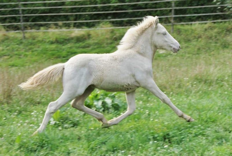 Fagurfifill ein heranwachsendes Traumpferd in Weiß mit blauen Augen - like a Unicorn Für kurze Zeit noch wegen Reduktion zum Fohlenpreis zu haben bei zeitnaher Abholung und Bezahlung noch im Januar. Kein Tausch. Er ist weiß geboren da er Doppelcreme = reinerbig Creme ist. Getestet wurde er als Perlino AaEe zusätzlich ist er mischerbig Schimmel N/G. Da er selbst schon weiß geboren ist hat das Schimmelgen auf seine eigene Farbe keine sichtbare Auswirkung. Fagurfifill überzeugt vom Tag seiner Geburt an mit seinem unkomplizierten freundlichen und vertrauensvollen Charakter. Er ist immer sofort bei einem, sucht den Menschenkontakt und ist auch an allem Interessiert was um ihn herum passiert. Vom Temperament zeigt er sich bis dato sehr ausgeglichen mit guter Lauffreude und stehts klarem Kopf. Durch seine Haltung kennt er viele Umwelteinflüsse und begegnet diesen jetzt schon relativ gelassen. Er wächst bis dato artgerecht und gut sozialisiert in einer altersgemischten Jungstruppe auf. Wird regelmäßig entwurmt, ist geimpft gegen Tetanus und Influenca, Ekzemfrei aus ekzemfreien Eltern, regelmäßig Hufe gepflegt- Hufpflegefromm, kennt die tägliche Gabe von Zusatzfutter mit Mineralfutter. Durch Weideumtrieb mit Pferdeanhänger von Fohlen an das Verladen und gefahren werden im positiven gewöhnt dadurch Verladefromm. Er ist mit seinen derzeit 1,5 Jahren gut Entwickelt und von Geburt an mit stabilem Fundament ausgestattet, natürlich jetzt als Jungpferd auch oft im Gebäude wachstumsbedingt nicht immer schön anzusehen, aber anhand seiner Eltern sollte er später mit harmonischem sportlich stabilem Gebäude und Endmaß um die 140 glänzen. Zudem hat er von seiner Mutter die mega Mähne geerbt, welche immer länger wird. Fagurfifill ist Fünfgangveranlagt mit ausgeprägten guten Grundgängen. Sein Schritt sauber vorhanden, die ersten Wochen nach Geburt hat er fast ausschließlich Tölt gezeigt und zeitweilig auch Pass. Seitdem er den Trab gefunden hat zeigt er diesen sicher, raumgreifend mit viel Schub und Tempofähigkeit. Je nach Tagesform ist der Tölt immer wieder mindestens in den Übergängen und mehr sichtbar. Sein Galopp ist für einen Fünfgänger gut ausgeprägt mit oft Bergauftendenz versehen. Ganglich bringt er viel Potential und wäre nicht nur ein zukünftiges gehobenes Freizeitpferd sondern bietet auch die Option auf Sport. Seine gute Abstammung ergänzt seine perfekte Mischung aus bestem Charakter und Gangvermögen. Es finden sich bei ihm hoch geprüfte Pferde wie der Álfur frá Selfossi Sohn Þórálfur frá Prestsbæ. Den Krákur frá Blesastöðum 1A Sohn Þorlákur frá Prestsbæ und Skjanni fra Nyjabae Sohn des Hróður frá Refsstöðum. Wie auch den bekannten Klettur frá Hvammi. Sein Stammbaum ist bis einschließlich den Urgroßeltern vollständig DNA bestätigt, erst dannach gibt es DNA-Lücken da nicht von allen Pferden DNA vorliegt. Fagurfifill kann auf Wunsch gegen Kostenerstattung noch bei mir Kastriert werden und nach Abheilung dann erst ins neue Zuhause umziehen. Beide Hoden sind abgestiegen vorhanden. Aktuell ist er recht plüschig, er kann gerne persönlich kennengelernt werden. Die Fotos sind von Fohlen bis Winteranfang 25. Es gibt lediglich nur das Fohlenvideo, weitere Videos sind derzeit organisatorisch und Platztechnisch nicht machbar. Bei echtem Interesse freue ich mich auf Nachricht. Ab 01.02.2026 wird er für 4800 € abgegeben, Preis mit weiterer Aufzucht steigend, um die bis dato angefallenen Kosten der Zucht/Aufzucht wenigstens decken zu können.
