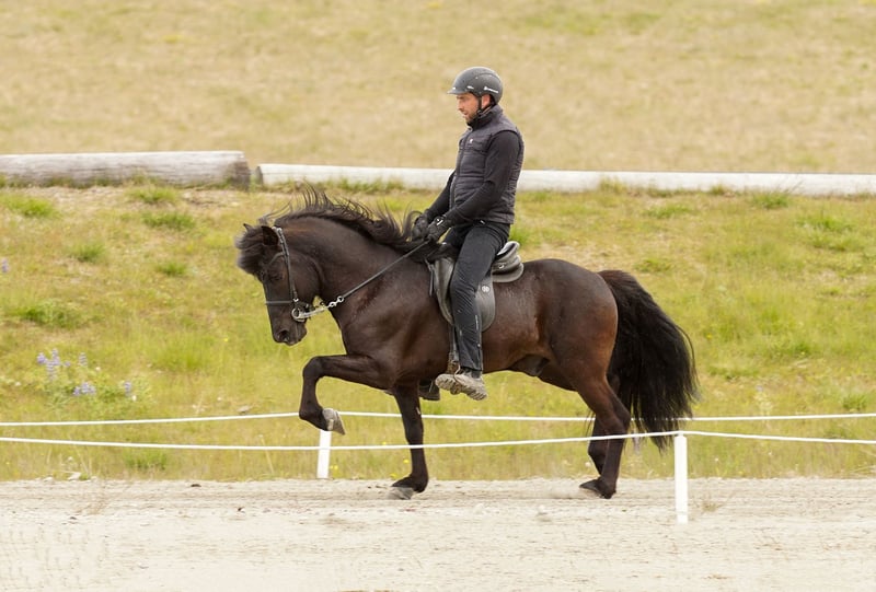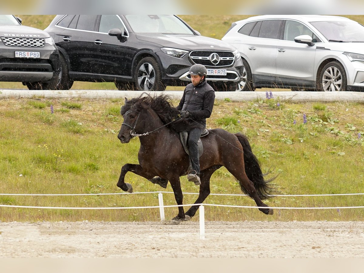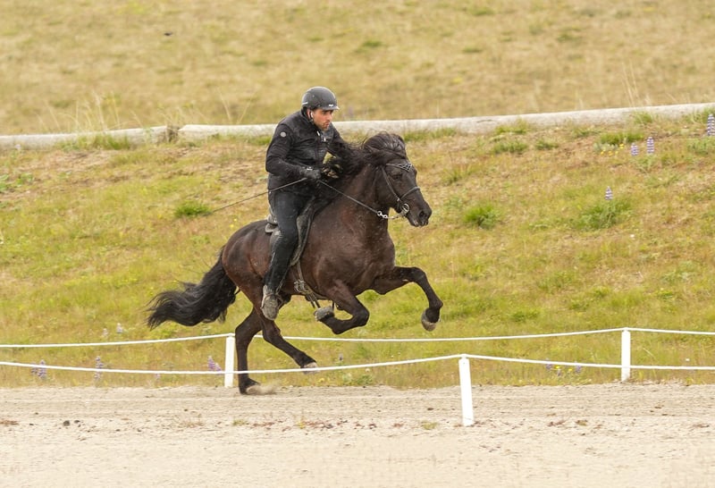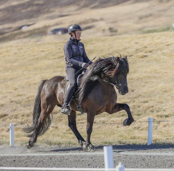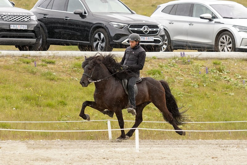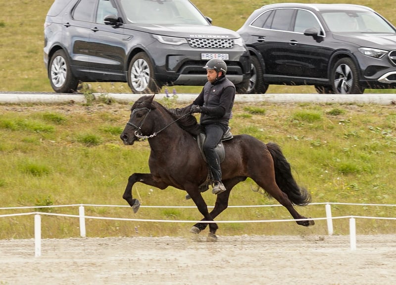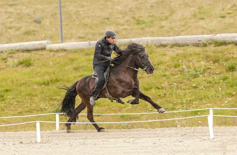 Merkúr frá Gásum FEIF ID: IS2019164001 Rappe ohne Abzeichen mit viel Langhaar Fünfgänger FIZO geprüft✅ Merkúr´s Abstammung ist durchgehend geprüft, sowie auch er. Sein Zuchtwert/BLUP liegt aktuell bei grandiosen 120‼️ Merkúr konnte eine Gebäudenote von 8,40 erreichen. Hier gab es die 9,0 für Rückenlinie-Kruppe und Mähne-Schweif. Die 8,5 erhielt er auf Widerrist-Schulter, Proportionen und Hufe. Seine Reiteigenschaften mit 8,32 wurden mit einer 8,5 für Tölt, Trab, Pass, Rittigkeit und für die Form unter dem Reiter bewertet. Das ergibt sechsjährig eine Gesamtnote von 8,35. Abstammung: M: Magdalena frá Kommu 8,35 VM: Markús frá Langholtsparti 8,36 MM: Melkorka frá Kommu 7,72 V: Skaginn frá Skipaskaga 8,73 VV: Álfur frá Selfossi 8,46 MV: Assa frá Akranesi 8,31 Merkúr ist ein typvoller, ausdrucksstarker Hengst, mit hervorragendem Charakter und viel Präsenz. Schon in sehr jungem Alter überzeugte er mit fünf klar getrennten Gängen, mit viel Raumgriff und Takt. Im Tölt punktet er mit Tempovarianz, hochweiten Bewegungen und ist gleichermaßen T1 als auch T2 geeignet. Trab ist schwungvoll mit viel Raumgriff. Galopp gut gesprungen und taktklar. Pass ist besonders hervorzuheben, denn dieser ist von sehr guter Qualität und extrem einfach zu reiten. Aufrund seines einwandfreien Charakters lässt er sich immer legen und zurücknehmen. Dieser lackschwarze Hengst vereint Leistungsbereitschaft und ein ausgeglichenes Wesen - genau das, was man sich in der eigenen Zucht wünscht. Egal ob du ein Sportpferd oder ein Freizeitpferd züchten möchtest, Merkúr vereint beides. Ihn selbst können ungeübte Reiter reiten, Kinder führen und dabei immer ein sicheres Gefühl haben. Seine Nachzucht bisher punktet mit harmonischem Körperbau, guter Gangveranlagung und einwandfreiem Charakter.