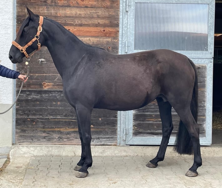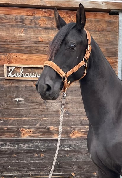 As we are shifting our breeding focus, we are offering our wonderful Kabardian broodmare Bahira for sale. Bahira is a stunning black mare with an excellent temperament, and she is a caring and outstanding mother. Artificial insemination is straightforward, pregnancy is uncomplicated, and all her foalings have been equally smooth. We have three beautiful foals from her. The foals are half-bloods, as we have always bred her with full-blood stallions. She holds an Anglo-Kabardian passport issued by the Bavarian Breeding Association, where she is also registered in Breeding Book 1. Bahira is regularly dewormed, has seen the dentist, and is fully vaccinated. She has been ridden by her previous owner, but with us, she has only been used as a broodmare; she has not been ridden in our program. She has been worked on the longe or from the ground.