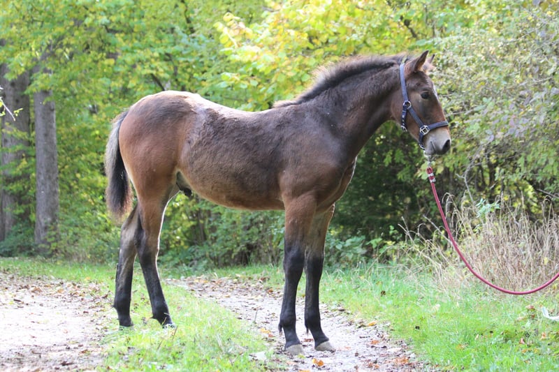 Luke vom Storchenmoos Date of Birth: 01.06.2025 Father: Löwenherz Mother: Thalia of Yore Mother/Father: Baldur aus der schützenden Hand Brown (does not change color) Estimated final height approx. 1.57m Luke is a very sweet, beautifully built little man. He already knows how to move and gets along very well in the herd. Sometimes, however, he still becomes the little mama's boy, using her, the boss, as a hiding place when he crosses a boundary with another herd member. He will be regularly dewormed, have seen the farrier, and will have received at least a tetanus vaccination by the time he leaves around December 2025. Additionally, he should have learned his foal ABC, including halter training, tying up, and being familiar with the trailer. Last two photos, mother and father.