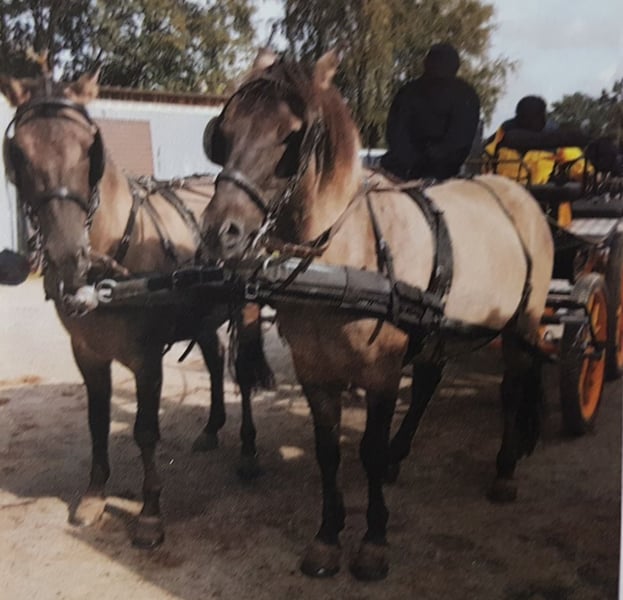 Friendly Connemara pony team, used for leisure driving and riding.