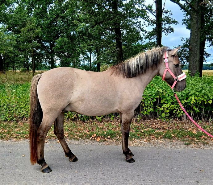 Haker 😍🤩💗🥰 3,5 j.a. angeritten. Sehr brav und absolut Menschenbezogen. Bildhübscher Konikwallach. ca. 1, 35m ( noch in Wachstum) Rasse: Konik, mit Vollabstammung Perfekt als Familienpferd/ für Geländeritte. Haker mag gerne putzen, führen, schmusen. In Umgang ist unkompliziert. Sehr Verschmusst und lieb. Er ist fit, gesund, ohne Mankos. Offenstall geeignet, Herdenverträglich. Videos vorhanden Transport möglich. Standort Lausitz, nähe Görlitz