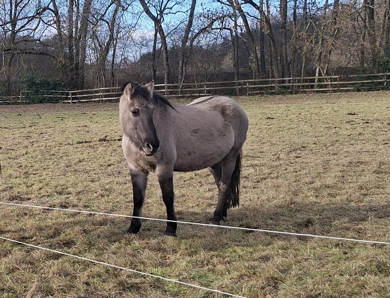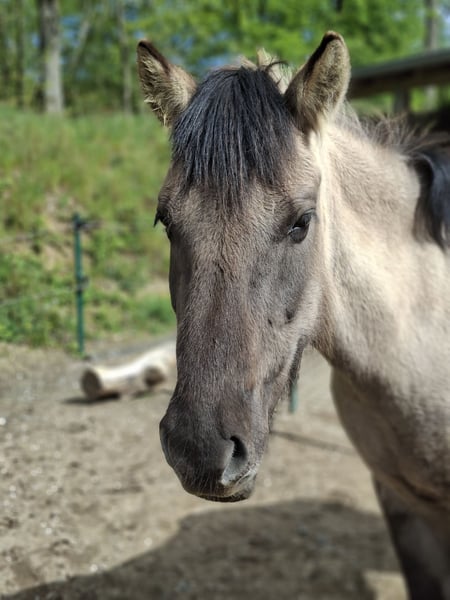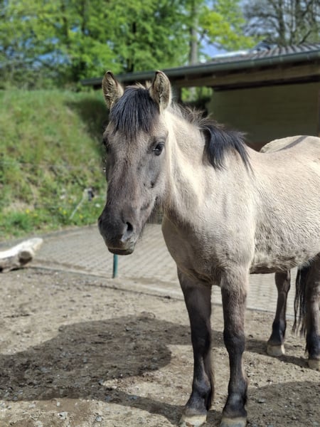 Luka ist ein 7jähriger Konikwallach. Sein erstes Lebensjahr hat er in einer Wildpferdeherde in der Nähe von Soest zugebracht. Er macht gerne mit bei Zirkusnummern, Gymnastik, Longieren, Spaziergänge, geht auch gerne als Handpferd mit. Er hat gute Hufe, geht barfuß, Hufbearbeitung geht völlig unproblematisch. Die Zähne sind gemacht, regelmäßig entwurmt. Er sucht jetzt liebe Menschen, die die weitere Ausbildung mit ihm in Angriff nehmen. Wenn er eingeritten werden soll, dann sollte der spätere Reiter nicht wesentlich mehr als 60 kg wiegen. Bei uns lebt Luka in einer gemischgeschlechtlichen Herde im Offenstall mit Auslauf und angrenzendem Sandplatz. Im Sommer Weidegang. Rangfolge: Mittel. Wir würden ihn gerne in einen Offenstall mit Auslauf vermitteln, Boxenhaltung ist ungünstig.