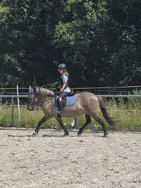Schweren Herzens und mit weinenden Augen, haben wir uns dazu entschieden, unsere liebenswerte Ponystute "Berta" zu verkaufen. Berta ist dreizehn Jahre alt und gerade im besten Alter. Sie ist ein absolutes Herzenspferd und im Alltag komplett unerschrocken. Wir bringen sie morgens im Winter im Dunkeln auf die Weide, an Autos, Lichtern, Schneepflug, Bussen usw. vorbei und auf sie ist immer Verlass. Sie ist bei uns nie ernsthaft krank gewesen und ist robust. Sie steht im Sommer 24/7 auf der Weide und hatte nie Probleme mit Hufrehe. Sie ist regelmäßig geimpft worden, hat keine Angst vor dem Tierarzt und auch beim Hufschmied ist sie brav. Sie ist aktuell barhuf, da sie sehr gute Hufen hat, hatte aber auch mal Eisen drauf. Meine Tochter kann alle Spielereien mit ihr machen, ob Popo rutschen, drauf stellen, unter ihr durch gehen, ist alles kein Problem. Ebenso ist sie in der Herde absolut brav und zeigt sich anderen Pferden gegenüber immer freundlich. Beim Ausreiten ist sie eine Lebensversicherung und bleibt immer bei der Gruppe, bockt und steigt nicht und kann hier auch von kleineren Kindern geritten werden. Wir haben regelmäßig mit ihr am Reitunterricht teilgenommen und auch kleine Sprünge springt sie. Sie liebt es an Agility Kursen teilzunehmen, da sie sich hier absolut unerschrocken zeigt. Gerade Bodenarbeit mit ihrem lieblings Mensch, macht ihr große Freunde. Sie ist trittsicher und gut zu sitzen. Der Grund, warum wir sie abgeben möchten, ist folgender. Meine Tochter hat bereits mit Berta einige Turniere geritten. Von Führzügel bis einfacher Reiterwettbewerb und war auch hier sehr erfolgreich. Leider hat uns Berta gezeigt, dass dies einfach nicht Ihre Welt ist. So geht sie dann Beispielsweise nicht mehr auf den Anhänger, oder rennt einfach aus dem Dressurviereck heraus :( Es ist unfair Berta gegenüber, etwas von ihr zu verlangen, was einfach nicht ihr Ding ist. Sie liebt lange, gemütliche Ausritte, herausfordernde Agility Kurse, Schwimmen gehen.... aber Turniere sind nicht ihre Welt. Deswegen verkaufen wir sie auch nur an absolute Freizeitreiter/innen, die keine Turnierambitionen haben. Sie liebt kleine Kinder und macht bei mir zurzeit das Bambini Reiten, wo 4 Kinder gleichzeitig auf ihr sitzen können. Ob beim Anmalen oder kleinen Spielen mit Bällen, sie bleibt immer ruhig und macht einen tollen Job. Wir verkaufen definitiv nicht in reine Boxenhaltung, sondern entweder in einen Offenstall oder wo stäglicher Weidegang gewährleistet ist. Der emotionale Wert dieses Pony ist für uns unbezahlbar, können aber leider kein weiteres Pferd unterhalten. Berta wird mit kompletten Zubehör abgegeben, einem Wintec Sattel, Trense, Decken, Halfter, Gamaschen, Schabracken usw. Bei Fragen gerne schreiben.