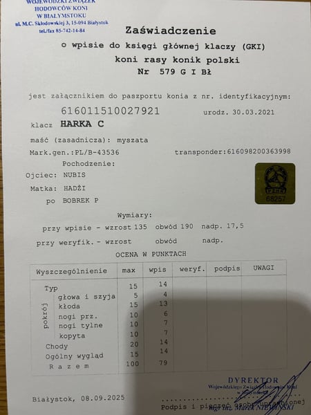 Klacz Konika Polskiego z pełnym pochodzeniem i licencją PZHK. Wpisana do księgi głównej hodowlanej Konika Polskiego. Po rodzicach programowych. Klacz szanuje człowieka, podaje kopyta regularnie werkowana przez kowala. Nasze konie utrzymywane są w systemie bezstajennym. Zdrowy silny odporny na warunki atmosferyczne koń. Przy zakupie pomagamy w organizacji transportu. Na miejscu lekarz weterynarii.