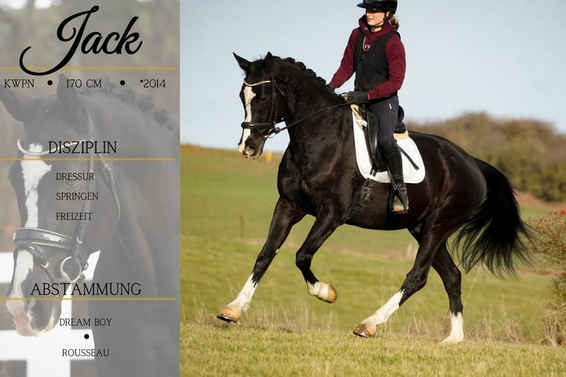 Jack Daniel ist ein 2014 geborener KWPN Wallach ca. 168 cm v. Dream Boy, Vivaldi x Rousseau, Ferro, Krack C *Jack Daniel* ist ein schicker Allrounder mit schönem Charakter. Schön zu reiten in der Bahn, geht leicht durchs Genick. Im Gelände hat er sich brav alleine und in der Gruppe gezeigt. Jack springt auch gerne mal einen Baumstamm und zeigt auch hier Freude. Er eignet sich auch für Jugendliche Reiter. !!! SCHAUEN SIE SICH UNBEDINGT SEIN VIDEO AN !!! Er ist zudem international gestartet ( hat auch einen FEI Pass - gültig bis 7/8/27) dabei. Er ist in der Kutsche vorgestellt, zu seiner weiteren Eignung hierzu können wir nicht viel sagen, da wir weder die Ahnung vom Fahren haben noch dies testen können). Er bringt Röntgenbilder bereits mit. Ein aktuelles Video finden Sie hier in der Anzeige oder unter folgendem Link: https://www.youtube.com/watch?v=wdCZpp4cBPc Pferdehandlung Dederichs – Ihr Partner für den Pferdekauf Kontakt & Erreichbarkeit: Anfragen bitte ausschließlich telefonisch unter 0173/9792139 Montag – Freitag: 09:00 – 18:00 Uhr Samstag: 09:00 – 15:00 Uhr Sonntag: Ruhetag Folgen Sie uns auf Social Media! Erleben Sie unseren Alltag mit den Verkaufspferden auf Instagram, TikTok & Facebook unter Pferdehandlung Dederichs Rabatt: Bei sofortiger Mitnahme Ihres neuen Traumpferdes erhalten Sie zwischen 5 %– 10 % Rabatt Probereiten & Vorführen: • Probereiten: 40 € pro Pferd (max. 2 Reiter), Betrag wird beim Kauf angerechnet • Feiertage: Proberitt 50 € • Vorführung durch unsere Bereiter: 30 € pro Pferd (Vorreiten, Bodenarbeit etc.) Ankaufsuntersuchung & Transport: • Viele unserer Pferde besitzen bereits eine AKU • Sie können selbstverständlich Ihren eigenen Tierarzt mitbringen • Gerne organisieren wir eine Untersuchung • Wir unterstützen Sie auch gerne beim Transport ins neue Zuhause Weitere Verkaufspferde: In unserem Stall stehen weitere Verkaufspferde, die noch nicht online sind. Falls Ihr Traumpferd noch nicht dabei ist, zögern Sie nicht, uns zu kontaktieren. Wichtige Hinweise: • Stockmaß-Angaben sind geschätzt und nicht exakt nachgemessen • Alle Beschreibungen sind subjektive Einschätzungen des Verkäufers und keine zugesicherten Eigenschaften