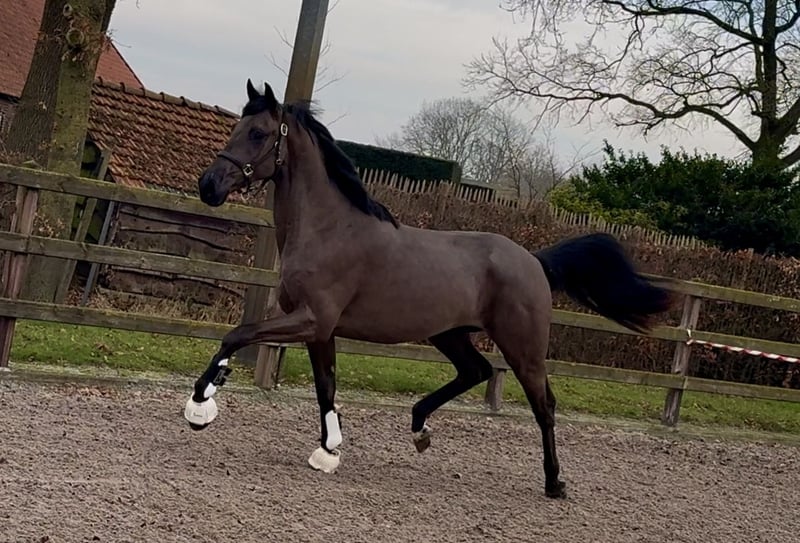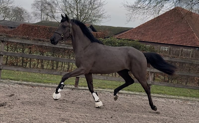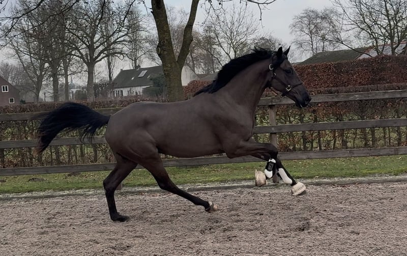 -- Tomorrowland FB -- KWPN by Extreme US x Westpoint x Welt Hit II Gelding, born 2023, 1.67m A very striking young dressage horse with a true 'wow factor'! Beautiful dressage conformation with a lot of presence. Moves with great suppleness and good technique, lots of balance, and an excellent walk. Comes directly out of the group, so not yet in training. A pleasant horse to handle, with a calm temperament. He is regularly in the horse walker, paddock, crossties, etc. Recently examined radiologically with no remarks. Can undergo further inspections upon request.