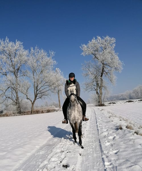 Ta klacz jest bardzo delikatna i wymaga jazdy z prawidłowymi, spokojnymi pomocami. Reaguje wrażliwie na swojego jeźdźca i ceni sobie jasną, pewną komunikację. Dlatego chętnie sprawdza też swoje granice i potrzebuje doświadczonego, opanowanego jeźdźca. W terenie jest absolutnie niezawodna – zarówno samodzielnie, jak i w grupie. Z dziećmi chętnie chodzi spokojnym krokiem na wycieczki. Ze względu na jej charakter i wrażliwość nie jest jednak odpowiednia dla początkujących jeźdźców. Chętnie pracuje codziennie i lubi różnorodność: prace na ziemi, ćwiczenia z circlingiem, lonżę, przejażdżki czy jazdę dressage – wszystko sprawia jej radość. Motywuje się do pracy, szybko się uczy i zawsze wykazuje chęć do nauki. U mnie nie skakała już przez przeszkody, ale od poprzedniego właściciela są dostępne filmy, na których skacze do klasy A. Podkreśla ją również jej świetne pochodzenie, które dodatkowo podkreśla jej potencjał. To wspaniały koń dla ambitnych jeźdźców, którzy czerpią radość z różnorodnej pracy i cenią sobie wrażliwego partnera. Życzę jej codziennego dostępu do pastwiska lub wybiegu otwartego.