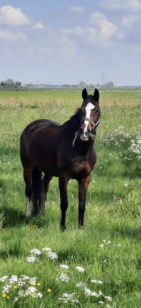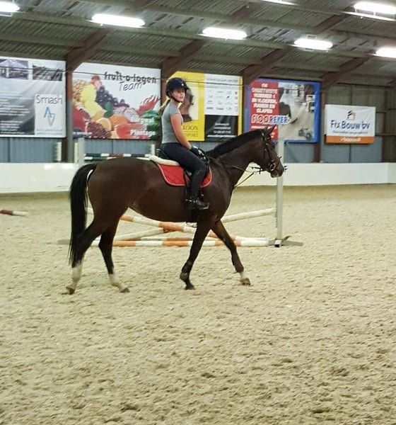 Sweet, brave allround e-pony, 156.5 cm, looking for an enthusiastic rider for both dressage and jumping, would be suitable for a somewhat advanced rider coming from a C or D pony. Enjoys going to the forest. M-Dressage. Beautiful, spacious gaits. Jumping 80/90 cm, gets enthusiastic when jumping. Given the size, also suitable for example for a mother/father, daughter/son. A pony that likes to work for you. Pedigree known to us, already in our possession for 8 years. Sucks in some air after eating pellets, but has no issues with it when wearing a band. Likes to go outside during the day, pasture/paddock and at night in the stable. Vaccinations up to date, well-behaved with the farrier, front feet shod, easy to load in the trailer, well-behaved when clipped. Prestige jumping saddle available for takeover. Vet check at buyer's expense. If interested, call 06-55383566.