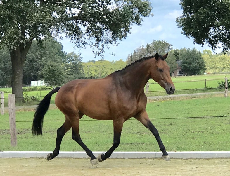 Esta hermosa y elegante yegua de doma tiene en su linaje a Zonik y Farrington. Nacida en 2013, tiene 12 años y mide aproximadamente 1.71 m. Es una yegua con una flexibilidad y un movimiento excepcionales. Actualmente está embarazada de Saint McLaren, con una fecha prevista de parto a mediados de abril, en su quinto mes de gestación. Tiene un carácter maravilloso, algo introvertida, muy tranquila y obediente en la mano, confiable incluso en terrenos desconocidos y en el establo. Es una yegua sensible, lo que se refleja en que requiere pocas ayudas durante la monta. Montarla resulta una experiencia fantástica. Lamentablemente, la yegua no está exenta de defectos y puede variar en su disponibilidad para montar. Actualmente, está mejorando. Tras varias exploraciones exhaustivas, no se ha podido determinar exactamente qué le sucede. Sin embargo, tiene un casco en pendiente y en esa pata suele cojea, aunque una inyección en la articulación del casco suele aliviar la situación, como hemos hecho recientemente por segunda vez. Para mayor soporte, lleva herraduras en la parte delantera. Posee papeles excelentes y, por cuarta vez en su vida, ha quedado preñada en su primer intento. En el pasado, ha sido utilizada en competiciones, aunque no la vendemos como caballo de deporte. Es muy probable que sea apta para montar de forma recreativa, y además, es una hermosa yegua de cría con un potro en camino. Se vende con el corazón pesado debido a circunstancias personales. Es fundamental encontrarle un buen hogar.