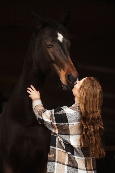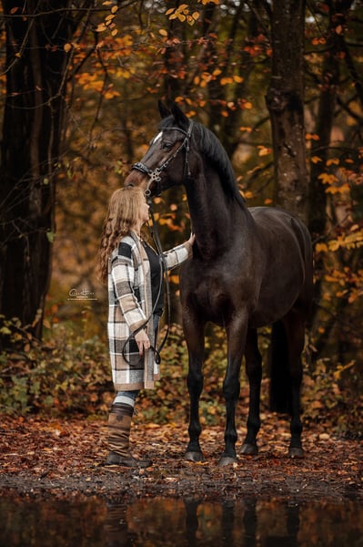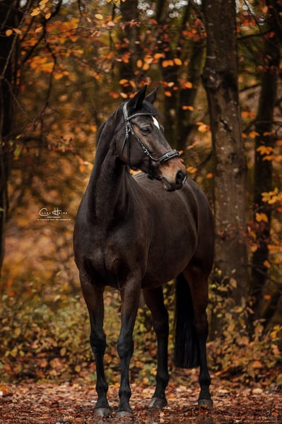 People-oriented and intelligent, affectionate and friendly. Very attached to humans. Due to ossification on the neck ligament, no longer suitable for dressage riding. Suitable for trail riding but requires a confident handler. Forms a strong bond with her person and loves them deeply. Only available as a companion horse. We see her as an ideal partner for circense and groundwork. Learns extremely quickly and always wants to please. Not suitable for stall confinement alone. Not suitable for beginners or riding schools. Also suitable for breeding. Daughter of Olympic champion Scandic. With a heavy heart, offered to loving hands.