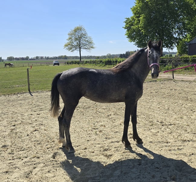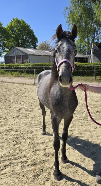 Wegens een gebrek aan tijd door een opgroeiend gezin, bied ik mijn 3-jarige merrie Teddy te koop aan. Teddy is een prachtige schimmel met een uitstekende afstamming. Ik heb haar rechtstreeks van de fokker gekocht, maar wegens de drukte van een jong gezin en een gebrek aan tijd, kan ik haar niet de begeleiding en training bieden die zij met haar talent verdient. Teddy komt uit een zeer sterke lijn. Haar vader is de kampioenshengst Magnifiek (KWPN Tuigpaard). Haar moeder is Maddy DH (Stb. Keur, IBOP-tuig). Teddy beschikt over drie correcte gangen met veel zelfhouding en een krachtig achterbeengebruik. Ze toont van nature veel atletisch vermogen en ze springt makkelijk. Teddy is een eerlijk, luxe en talentvol paard dat klaar is om aan het werk te gaan. Ze heeft de looks en de instelling van een echt sportpaard. Ze is voorwaarts maar wel eerlijk. Teddy is zeer sociaal en ligt makkelijk in de kudde. Ze is braaf bij de hoefsmid, trailer laden is geen probleem. Ze is correct geënt, ontwormd en volgens schema bekapt. Er is een begin gemaakt met grondwerk. Ze pakt nieuwe dingen snel op en is werkwillig. Teddy is een paard dat de sport in moet. Wij zoeken een ruiter die haar kwaliteiten op waarde weet te schatten en haar met geduld en kennis verder kan opleiden Ze is niet gekeurd. Uiteraard toegestaan k.k.