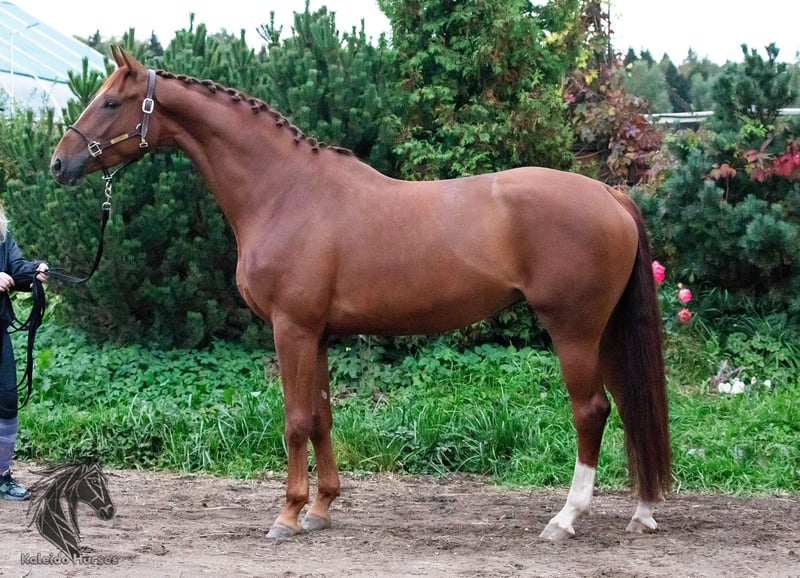 Year of Birth: 2021 · Height: 173 cm (17 hh, still growing) · Color: Chestnut · Breed: KWPN (Dutch Warmblood), full import pedigree. · Sire's Line: Edelson (KWPN) - lines of Zhivago, Krack C, Gribaldi. · Dam's Line: White Rose (Hannover) - lines of World Diamond, Rotspon. · Temperament: Exceptionally kind, people-oriented, and calm.