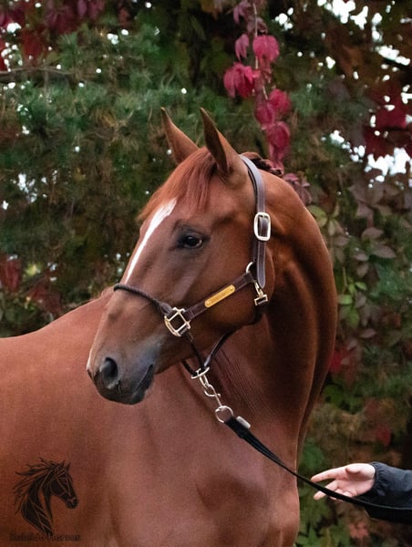 Année de naissance : 2021 · Taille : 173 cm (17 hh, encore en croissance) · Couleur : Alezan · Race : KWPN (Cheval de Sang Hollandais), pedigree d'importation complet. · Lignée du père : Edelson (KWPN) - lignées de Zhivago, Krack C, Gribaldi. · Lignée de la mère : White Rose (Hannovre) - lignées de World Diamond, Rotspon. · Tempérament : Exceptionnellement gentil, orienté vers les gens et calme.