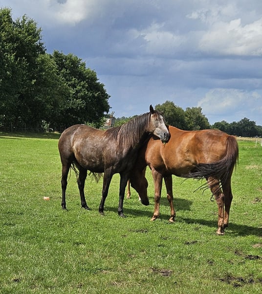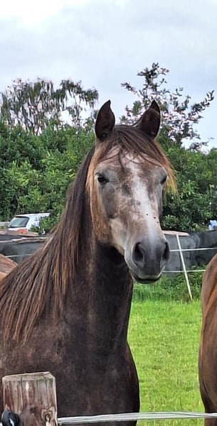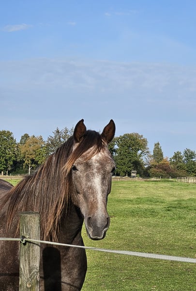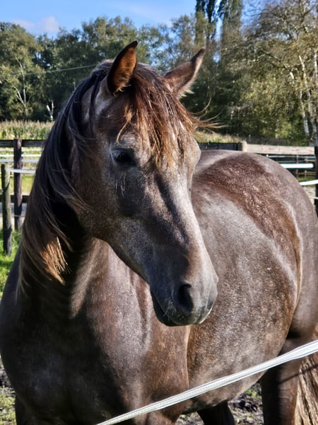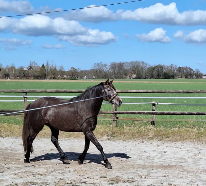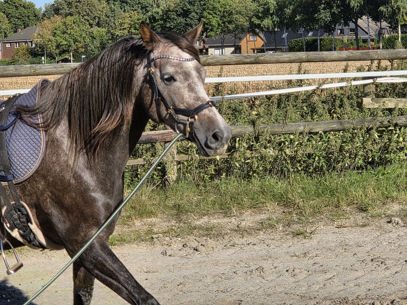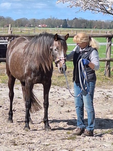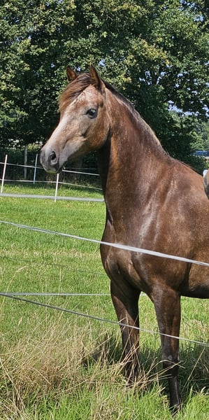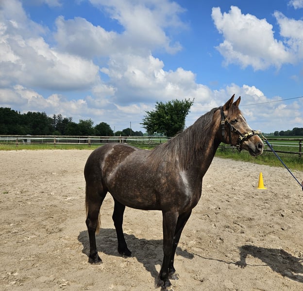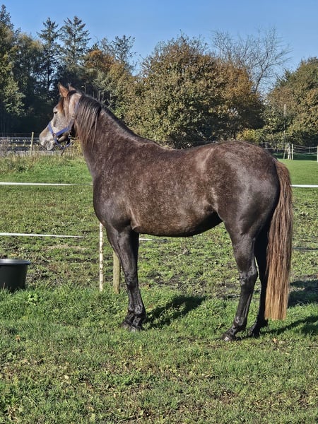 Biete hier meine wunderschöne "kleine" Stute zum Verkauf auf Grund gesundheitlicher und zeitlicher Probleme meinerseits. Schimmelchen, wie sie hier liebevoll genannt wird, ist jetzt diesen Sommer anlongiert, kennt Gurt, Sattel mit Bügeln, Kappzaum und Trense. Wir haben uns auch schon drübergelegt. Sie macht alles brav mit. Man könnte jetzt mit dem schonenden anreiten beginnen. Schimmelchen kennt auch Bodenarbeit, Stangen, Pylonen, etc. Sie ist selbstverständlich Schmiede und Verladefromm. Leichtfuttrig und keine Unarten. Gesund, geimpft und entwurmt. Sie ist hier im Herdenverband aufgewachsen und verträglich mit Stuten und Wallachen. Sie wurde wegen der Spätentwicklung (Spanier) erst in diesem Jahr angefangen. Sehr gut könnte ich sie mir bei Disziplinen wie z.B. Equitation Working vorstellen, dieses war eigentlich mein Ziel. Wenn Sie die kleine kennen lernen möchten gerne melden. Ich wünsche mir für sie ein schönes zu Hause auf Lebenszeit. Videos von der Arbeit gerne bei ernsthaften Interesse Halbschwester im Sport erfolgreich Springen A-L, Dressur A Schimmelchen ist ein Kind der Liebe und hat deswegen "nur" einen Pass. War mir persönlich egal, da man auf den Papieren