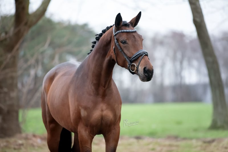 Stute Despacito x Benneton Dream ca. 173 cm Diese äußerst talentierte Stute verfügt über eine elegante Gangart und ein sehr gutes Hinterbein. Ein Pferd mit überdurchschnittlicher Qualität, sehr brav im Umgang und unter dem Sattel. Das Pferd ist gelassen und zeigt sich unter dem Sattel absolut unerschrocken. Keine Marotten einer Stute, lieb und freundlich auf der Stallgasse. Sie ist circa 174 cm groß und steht gerade auf den Hufen. Bereits war sie auf fremdem Gelände unterwegs, was sie sehr brav meistert. Auch im Wald zeigt sie sich brav. Ein sehr feines Pferd für jemanden, der in der Turnierpferdeklasse glänzen möchte! Das Pferd ist vollständig sporttauglich geprüft, inklusive Beinen, Rücken und Hals.