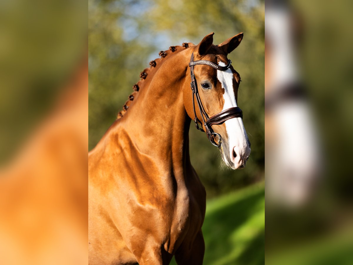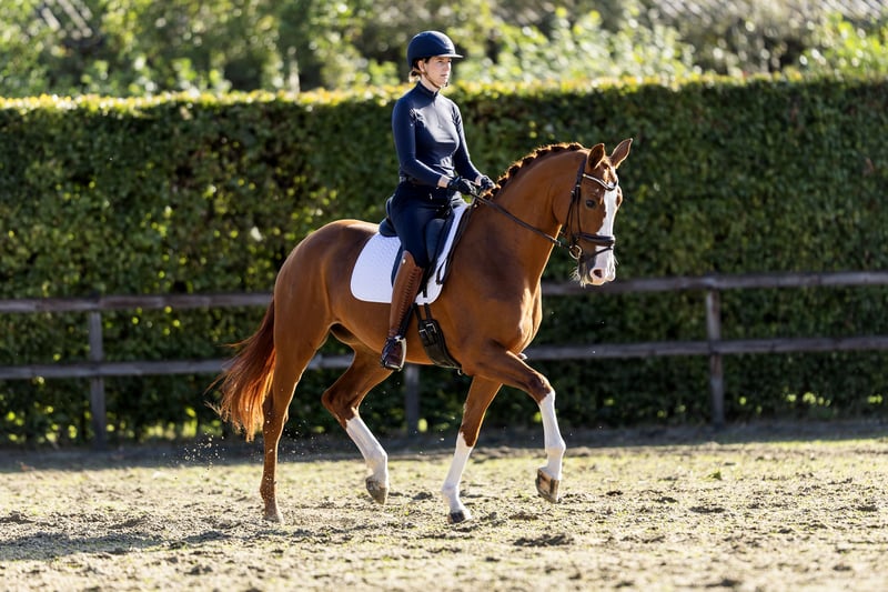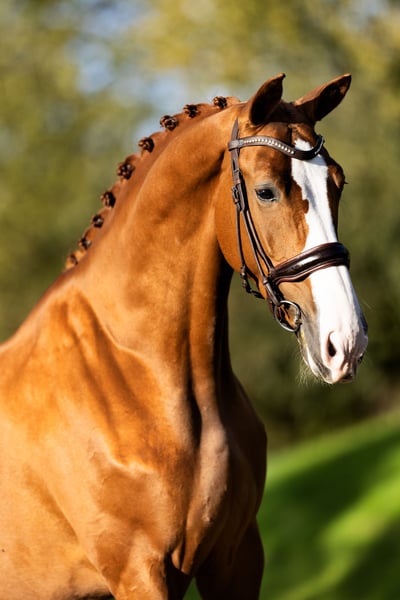 Six-year-old mare that stands out! Ouzo effortlessly passed her IBOP test, scoring an 8 for movement, an 8 for canter, and an 8 for posture. She also achieves high scores in competitions. She knows the exercises of M-level dressage and is already performing a green flying change. She has an incredibly pleasant temperament, making her suitable for all types of riders. This is a horse that will bring you a lot of joy. Her dam, Vieux, holds the Elite title and was successful at Z2 level. With her exceptional pedigree, Ouzo is also a highly interesting prospect for breeding (both now and in the future), with a low inbreeding coefficient of just 1.5%.