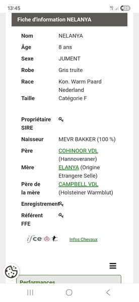 🐴 Springpferd für den Springreitsport zu verkaufen KWPN-Stute, 8 Jahre alt Sehr gute Abstammung: Vater: Cohinoor VDL Muttervater: Campbell VDL 👉 Derzeit: Erfolgreich in Parcours bis 110 cm 👉 Potential: Eine Stute mit den Voraussetzungen, sich auf 125/130 cm zu entwickeln, bei entsprechender Arbeit. 👉 Anlongiert Ende ihres fünften Lebensjahres. 👉 Aktuell im Einsatz auf 110 cm, nicht aus mangelnder Fähigkeit, sondern aufgrund der Unerfahrenheit der Reiterin. NELANYA ist eine Blutstute, sensibel, respektvoll und willig. ✔️ Gute Bewegungsqualität ✔️ Im Alltag unkompliziert ✔️ Gesund und in Betreuung 🩺 Tierärztliche Untersuchung vor 2 Jahren durchgeführt: Röntgenaufnahmen der Hufe, Ballen, Sprunggelenke, Fesselgelenke 📍 Sichtbar in Morlaas 💰 Preis: 20 🥕🥕🥕 (Verhandlungsbasis) 📩 Für weitere Infos, Videos und Proberitte auf Anfrage