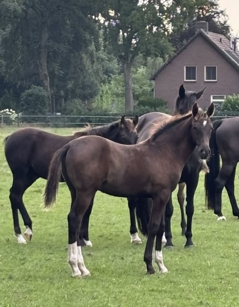 Bent u op zoek naar een veulen met uitstraling, kwaliteit en karakter? Maak dan kennis met ⚜️Valuno de Elegante CH ⚜️– een uitzonderlijk mooi en veelbelovend hengstveulen, ontstaan uit een unieke combinatie van Spaans temperament en Nederlandse dressuurkwaliteit. ⸻ 📍 Afstamming met toekomst • Vader: Elegante de Millan III CH - PRE Apto gekeurd • Moedersvaderlijn: Glock’s Toto Jr. x Ferro • Geboren op: 18-04-2025 • Verwachte stokmaat: ca. 1,70 m + Deze bijzondere combinatie verenigt: • Het vermogen tot verzameling, de expressie en rijbaarheid van de PRE • Met de moderniteit, elasticiteit en werkwilligheid van het KWPN Een pedigree dat wijst op een veelbelovende toekomst in de dressuursport. ⸻ 📍 Opfok met visie & liefdevolle zorg Onze veulens groeien op onder optimale omstandigheden: ✔️ 24/7 weidegang vanaf de geboorte ✔️ Sterke ontwikkeling van botten en pezen door natuurlijke beweging ✔️ Opfok in familieverband (merries en veulens samen) ✔️ Later in een gemengde kudde met paarden van verschillende leeftijden ✔️ Duidelijke sociale hiërarchie voor een evenwichtige opvoeding Het resultaat: Een mentaal stabiel, sociaal vaardig en fysiek sterk jong paard. ⸻ 📍 Vroeg gewend = ontspannen in het dagelijks leven Valuno wordt vanaf het begin gewend aan allerlei omgevingsprikkels: • Tractor • Bladblazer • Paraplu • Bosmaaier • Dagelijkse geluiden Met een ontspannen moeder aan zijn zijde leert hij dat dit allemaal heel normaal is. Reeds vanzelfsprekend voor hem: ✔️ Voetjes geven ✔️ Vaststaan ✔️ Poetsen & overal aangeraakt worden ✔️ Hoefsmid ✔️ Chippen ✔️ Ontwormen Alles verloopt probleemloos. ⸻ 📍 Conclusie Valuno de Elegante CH is niet alleen een echte blikvanger met een edele uitstraling – hij beschikt over de genetische aanleg, de solide opfok en het juiste fundament om: • Te schitteren in de dressuurring • Een betrouwbare partner te worden • Zijn toekomstige eigenaar jarenlang plezier te geven Een veulen met kwaliteit, karakter en potentieel – klaar voor een mooie toekomst. 🐎✨ Bij interesse of voor meer informatie (filmpje) horen wij graag van u.