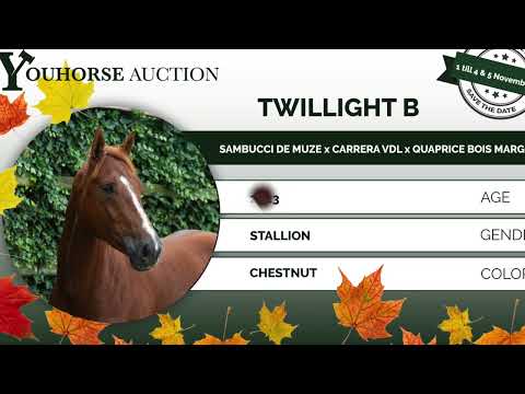 De tweejarige Twilight B is een schitterende vos met een goed model en goede bewegingen. Vader VDL Sambucci de Muze is zeven jaar en al internationaal 1.45m gestart met Luke Hill (GBR). Hij is gefokt uit de 1.60m Grand Prix-merrie Malissa de Muze, dochter van de invloedrijke fokmerrie Cordula de Laubry. Moeder Carice Z stamt af van de 1.60m Grand Prix hengst Carrera VDL. Grootmoeder, de genetisch zeer interessante Quanora Z (Quaprice Z x Carthago x Lux Z) leverde de goedgekeurde hengsten Cornet’s Quaprice (1.40m springen) en Cassanova PB Z (1.45m springen). Zelf kwam ze uit de 1.50m springmerrie Cutting Edge, gereden door Roelof Bril en Cian O’Connor.