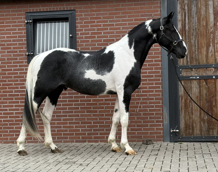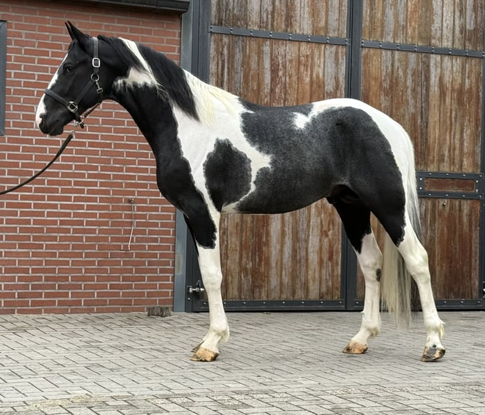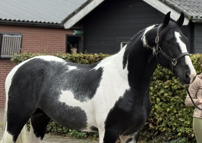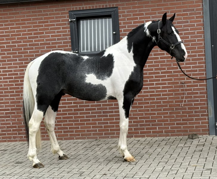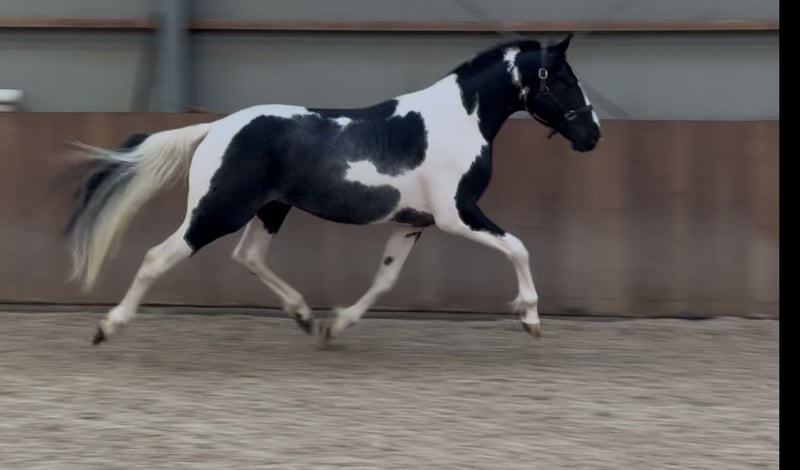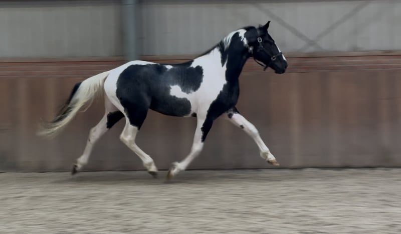 Siamo lieti di presentarvi Sake vd Lisdodde. Un stallone con presenza e un tipo moderno. Colpisce immediatamente per il suo bellissimo manto pezzato. Attualmente misura oltre 1,65 m. È onesto e gentile nel maneggiarlo. Inoltre, non è ancora stato addestrato. Ha movimenti ampi. In tutte le andature è leggero e possiede una buona tecnica. Mostra anche un buon salto. In breve, un stallone pezzato speciale con possibilità polivalenti. Se interessati, vi preghiamo di chiamare o inviare un messaggio. Un video è disponibile su richiesta.