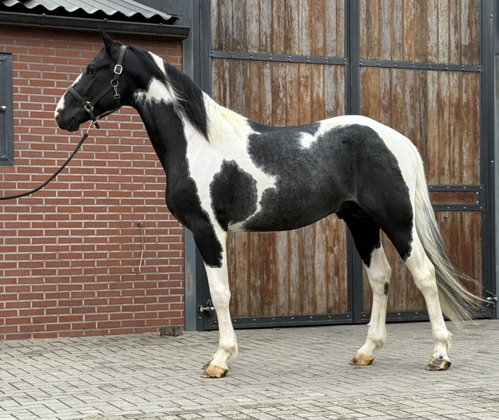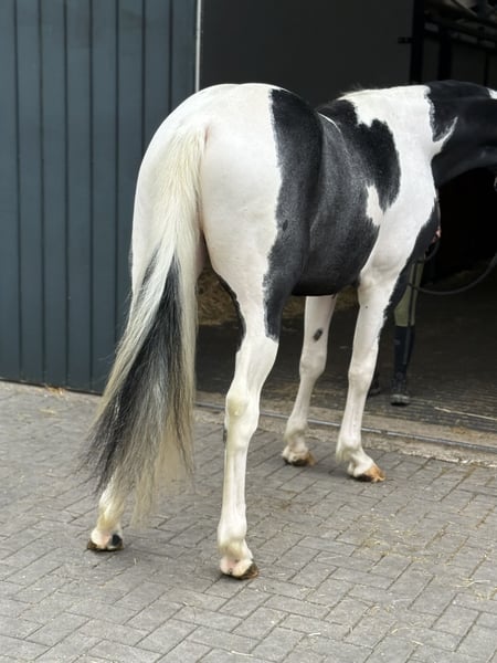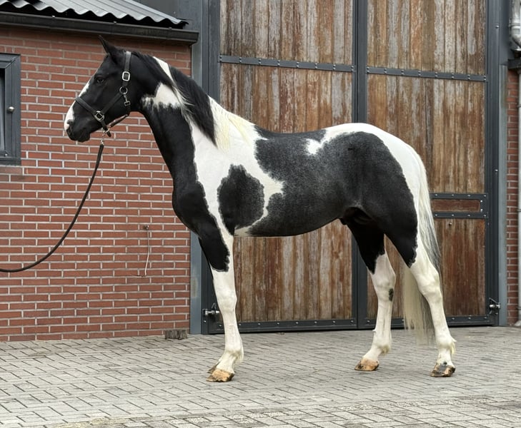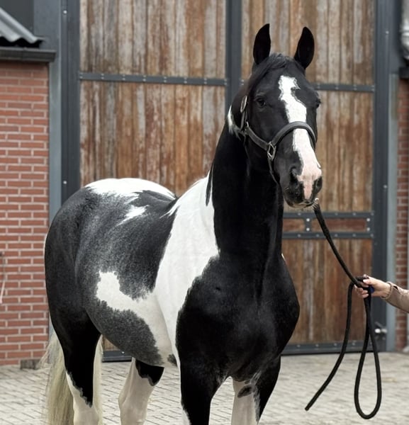 We would like to introduce you to Sake vd Lisdodde. A stallion with presence and a modern type. He immediately stands out due to his beautiful pinto appearance. He is currently over 1.65m tall. He is honest and well-mannered in handling. Furthermore, he is still untrained. He has expansive movements. In all gaits, he is light-footed and possesses good technique. He also shows a good jump. In short, a special pinto stallion with all-round possibilities. If interested, please call or message. A video is available upon request.
