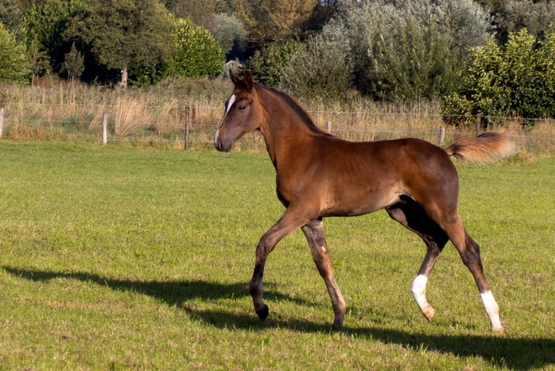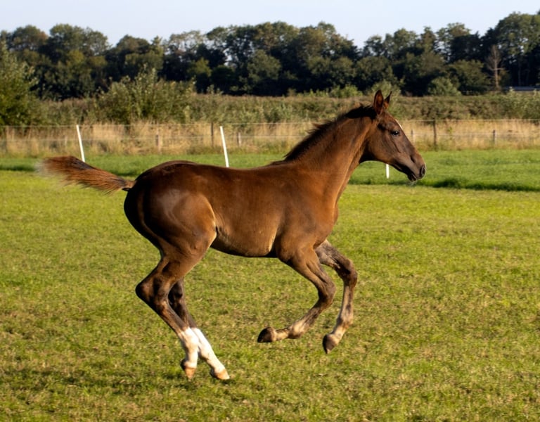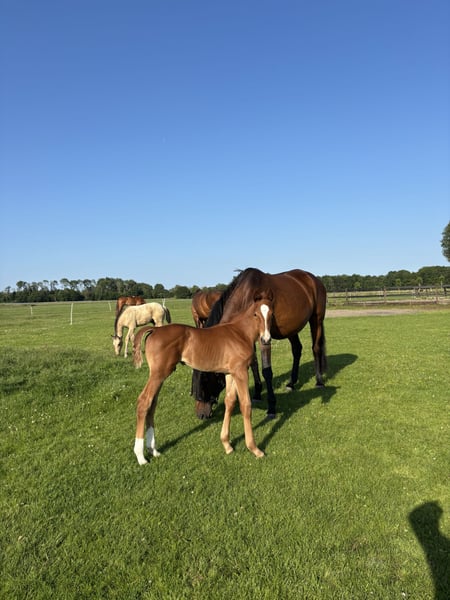 Vygo⭐️ Total Diamond PS x keur, sport, d-oc Lord Sinclair x elite, sport, prest. Fidermark nacido el 28-05-2025 Donnerhall, Gribaldi, Florestan, Rubinstein y Sandro Hit. Con estos sementales alemanes, este potro KWPN está libre de sangre neerlandesa (Jazz, Ferro y Flemmingh). Total Diamond ha dado descendencia de muy buena calidad, el año pasado se designaron potros jóvenes de premio en diferentes studbooks, lo cual es muy excepcional. Este potro castaño es de gran marco, largo, de patas altas y bien modelado. Tiene movimientos muy buenos con elasticidad y empuje, y proviene de una buena línea de deporte rica en premios y colaborativa. Es sociable, conoce el manejo con el cabestro, se comporta bien con el herrador y ha sido desparacitado. Su madre (Anky) es una yegua con la que he participado exitosamente en todas las disciplinas (doma, salto, concurso completo, paseos y trail). ¡Tiene un carácter excepcional y siempre quiere colaborar contigo! Su medio hermano (por Johnson) compite en GP y fue un caballo olímpico para Suecia. Busco para Vygo un lugar 5 estrellas, donde se le puedan ofrecer oportunidades para demostrar sus cualidades. Precio de venta 5900 Vendo a Vygo porque solo tengo yeguas en casa y también tengo un medio hermano de él en mi posesión. Más fotos y material de video a través de mensaje privado. Las últimas 2 fotos son de su madre.