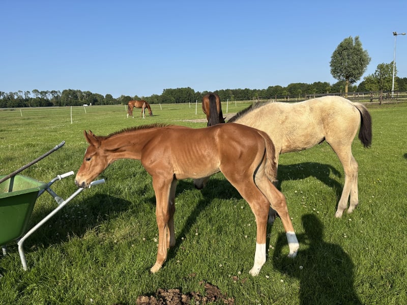 Vygo⭐️ Total Diamond PS x ster, keur, sport, d-oc Lord Sinclair x elite, sport, pref, prest. Fidermark born: 28-05-2025 Donnerhall, Gribaldi, Florestan, Rubinstein, and Sandro Hit. With these German stamp stallions, this KWPN colt is free from Dutch blood (Jazz, Ferro, and Flemmingh). Total Diamond has produced very good offspring; last year, several studbooks designated young premium stallions from him, which is very exceptional. Vygo has a very special color, silver chestnut! He has size, is large-framed, long-lined, has long legs, and is beautifully modeled. He has very good movements with spring and expression and comes from a good predicate-rich and cooperative sport lineage. People-oriented, knows how to walk on a halter, microchipped, well-behaved with the farrier, has had strangles vaccination due to the upbringing location, and is dewormed according to schedule. His mother (Anky) is a mare with whom I have successfully participated in all disciplines (dressage, jumping, eventing, trail rides, and track trail). She has a top character and always wants to work with you! Her half-brother (by Johnson) competes at GP level and was an Olympic horse for Sweden. I am looking for a 5* place for Vygo, where his qualities can be given a chance. I am selling Vygo because I only have mares at home and already have a half-brother of his in my possession. More photos and videos available via private message. The last 2 photos are of his mother.