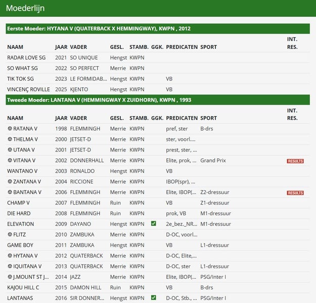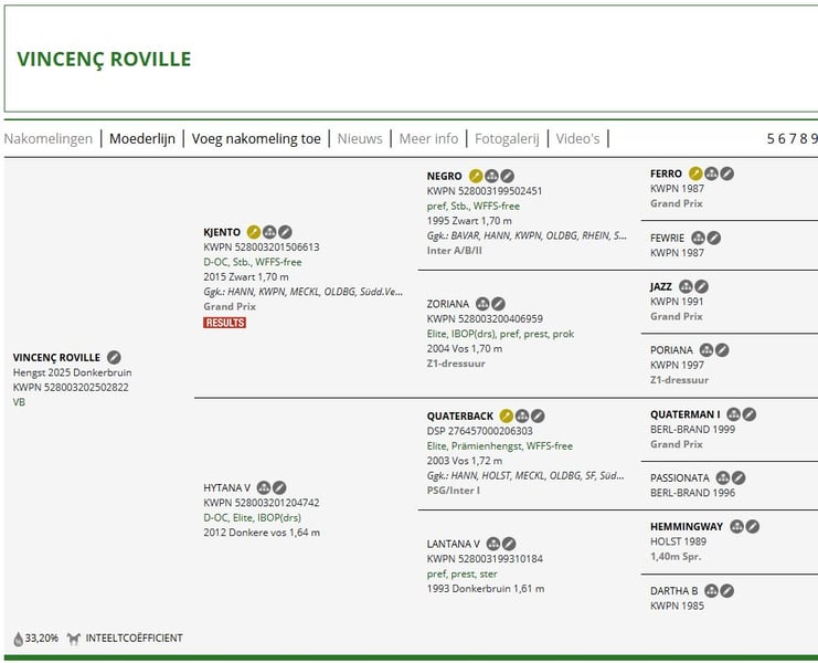 Hengstveulen (geboren op 14-04-2025) van Kjento uit Hytana V (Elite IBOP D-OC) v. Quaterback x ster pref pres v. Hemmingway. Uit de Lantana-lijn waar veel keur- en sportpaarden uit voortkomen. Vader Kjento (Negro x Jazz) is FEI wereldkampioen 6- en 7-jarige dressuurpaarden & KWPN Paard van het Jaar 2022. Moeder Hytana V heeft het Elite Predicaat en is een zeer sterk bewegende nakomeling van de beroemde hengst Quarterback welke vele goedgekeurde hengsten en sportpaarden in Duitsland heeft gebracht. Grootmoeder Lantana V is moeder van vele sport- en keuringspaarden. Ze is onder andere de moeder van Vitana V (mv Donnerhall) die Internationaal GP heeft gelopen onder Stephanie Peters en Morgan Brabançon Mestre en de moeder van Elite/LT merrie Mount St. John Jazz Dance. Vitana V is weer de moeder van Cennin welke vele Internationale GP successen heeft behaald onder Madeleine Witte. Verder is Lantana V de moeder van KWPN ggk hengst Lantanas (LT), de moeder van AES ggk hengst Elevation en de overgrootmoeder van de KWPN ggk hengst Dark Rousseau. Link HorseTelex: https://www.horsetelex.nl/horses/pedigree/2701412/vincen-roville Meer informatie, video’s of een bezichtiging? Neem gerust contact op (per WhatsApp +31652220717). Voor een sportief 🏠/snelle afhandeling is de prijs bespreekbaar.