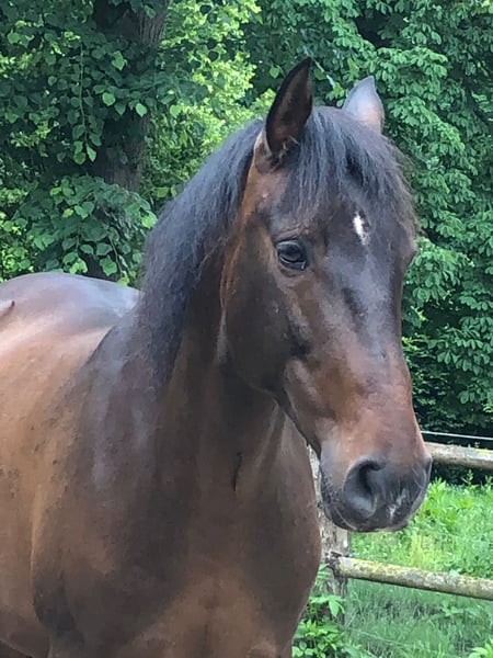 Fandango, Lusitano ohne Papiere (Cruzado), 10 Jahre, Stockmaß 154. Ich habe ihn mit 5 J gekauft. Wir haben einiges gemeinsam erlebt. Fandango ist vom Charakter: lieb, zugewandt und bezogen, intelligent und aufgeweckt, sensibel und feinnervig, einerseits coole Socke, andererseits noch unsicher im Gelände, er will alles recht machen - auch über seine Schmerzgrenze hinaus, er mag keinen Druck oder zu viel Energie, er kommt gut alleine klar, blüht auf in guter Gesellschaft, ist sehr verspielt und neckt gerne, ohne andere Pferde zu verletzen, ist oral aktiv (schnabelt gerne an allem herum), tanzt gerne (ist wendig und spielerisch in seinen Bewegungen). Fandango ist sehr bezogen auf seinen Menschen, daher nicht geeignet für mehrere Reiter. Kein Gewichtsträger. Gut gearbeitet am Boden, weniger vom Sattel aus. Er hat superweiche Gänge und reagiert fein auf Hilfen. Er ist unverbraucht, weil schonend und liebevoll gearbeitet. Aus verschiedenen Gründen mussten wir immer wieder Trainingspausen einlegen und jeweils neu beginnen. Gelände kennt er als Handpferd, von vielen Spaziergängen und einigen Ausritten. In Begleitung eines sicheren Pferdes ist er cool, alleine jedoch noch unsicher. Im Winter 2024/2025 ist er an equinem Asthma erkrankt aufgrund von schlechter Heuqualität (Staub und Schimmelpilz). Inzwischen sehr gut regeneriert, aber noch nicht wieder in super Kondition (näheres persönlich). Aufgrund der Erkrankung und daraus resultierender Stallwechsel wurde er knapp ein Jahr lang nicht geritten. Seit Januar reite ich ihn wieder. Ausbildungsstand entsprechend angeritten. Gerne im persönlichen Gespräch mehr Informationen dazu. Ich wünsche mir für ihn einen lieben und verantwortungsvollen Menschen mit reiterlichem Können und Erfahrung, der ihn weiter ausbildet und ihm einen festen und sicheren Platz in seinem Leben gibt. Idealerweise mit Privatpferdehaltung, da es dort möglich ist, auf die individuellen Bedürfnisse einzugehen. Offenstall und stabiler Herdenverband, viel Auslauf und Platz zum Spielen. Er ist eher rangniedrig und gliedert sich unkompliziert in eine neue Herde ein. Schön wäre auch eine naturnahe Haltung, in der er einfach Pferd sein darf und nicht geritten wird. Fandango wurde erst mit 5 Jahren gelegt und springt auf, weshalb eine gemischte Herde nicht zu empfehlen ist. Ich gebe ihn aufgrund der aktuellen gesundheitlichen Situation unter Wert ab. Platz vor Preis in allerbeste Hände.