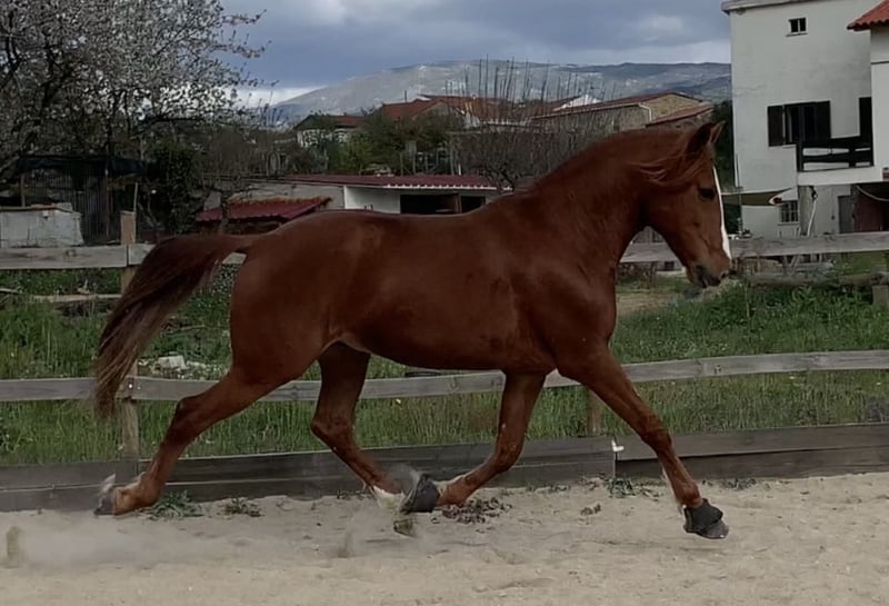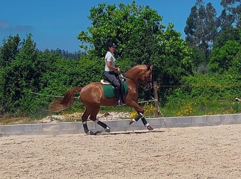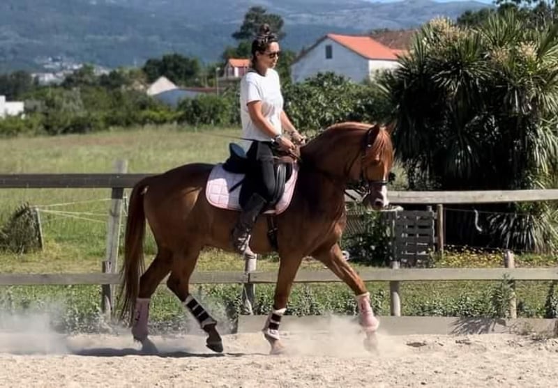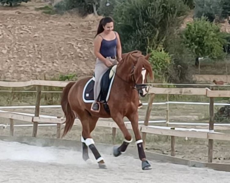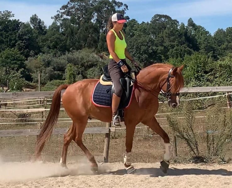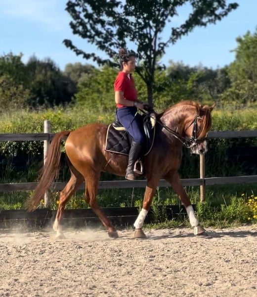 Beautiful chestnut Purebred Lusitano, standing 1.59 m at the withers An exceptionally kind and reliable horse, ideal for a beginner rider looking to learn, progress, and truly enjoy riding. Extremely safe and uncomplicated outside — not spooky, confident alone or in company, and very experienced at horse fairs and busy environments. On the ground he is a true gentleman: • Loads easily • Stands perfectly for the farrier • Respects fences • Easy to handle in all situations In the arena he is well trained and responsive, performing: • Leg yields • Shoulder-in & travers • Half passes • Flying changes • Beginning tempi changes • Starting canter pirouettes • Rein back • Highlight: Piaffe A wonderful partner for someone wanting a schoolmaster type to have fun while learning advanced movements in a calm and confidence-giving way. ✔️ Everything up to date: • Shoeing & farrier • Deworming • Teeth checked last year 📩 For more information, photos, and videos, please feel free to contact.