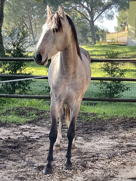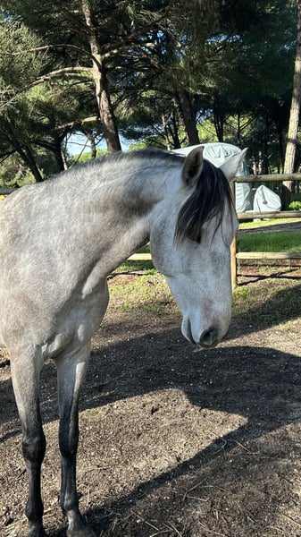 My name is Sibelius, and I will soon be four years old. I was born here at the stud farm in Portugal, raised in a herd on free-range pasture with the best care from my humans, and I have already gained my first riding experience. Now, I am looking for "my person" to stand by my side, with whom I will bravely face all future adventures together. I'm not very tall – but there are people who prefer a horse of compact size – and my true size is my loyal character. I am "only" gray and will become a grey (schimmel). My mother says, "A good horse has no color," so I am trying my best to be the best horse for you. Because one thing is certain: I am a genuine Lusitano, with all the qualities of this breed, and most importantly, I am completely healthy with flawless X-rays. I have also inherited some wonderful traits from my parents: my conformation is harmonious and perfect, and I am blessed with beautiful, elastic gaits. Would you like to get to know me so I can show you what I am capable of? Then we two can achieve great things and prove that even small horses can accomplish big dreams.