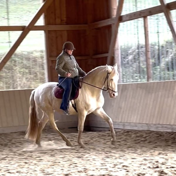 A 5-year-old Perlino with Dun coat seeking a new home. I am only offering him up because I cannot keep him with the mares due to his breeding activity. He has good basic gaits, including a very beautiful, large canter, and is easy to ride both indoors and in the field, making riding a real pleasure. Extremely affectionate and well-trained, he is an absolute dream horse. He has been solidly ridden but has not yet been extensively worked and needs further training.