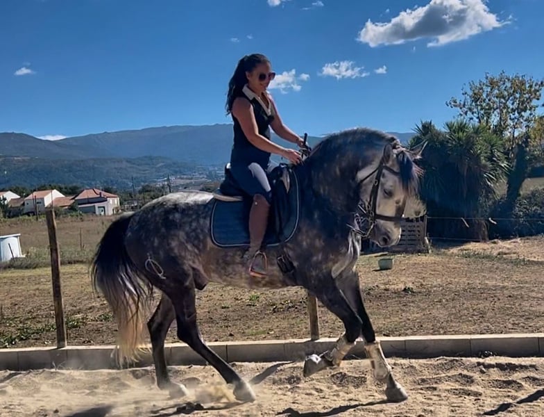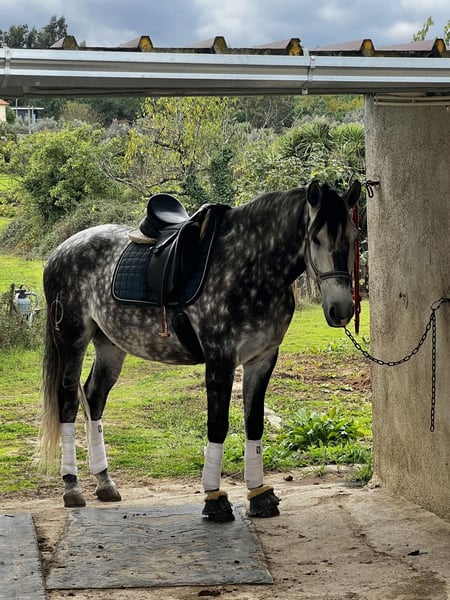 Poderoso is a stunning purebred Lusitano gelding, born in April 2019, standing at 162 cm at the withers, with exceptional bloodlines — Riopele on the dam’s side and Sociedade das Silveiras on the sire’s side. He is pirofree and X-rays are available. He is a brave, honest horse with an excellent character. On trail rides he is exceptionally safe, going confidently both alone and in company, and he especially loves leading the group. He is also very reliable in traffic and attended the Golegã Horse Fair for the first time this year, where he showed impeccable behaviour throughout. Under saddle, Poderoso is confirmed in walk, trot, and canter, and works with ease through leg yields, shoulder-in, travers, counter canter, walk pirouettes, half passes in all three gaits, and flying changes. He is now starting tempi changes and canter pirouettes, progressing quickly and willingly. In hand, he has lightly begun Spanish walk, passage, and piaffe, showing clear natural talent for the collected work. Poderoso would suit an amateur rider, as he is willing, safe, and straightforward, but he is also a sensitive horse, so a completely inexperienced rider would benefit from support from a trainer. We also have the possibility of transport throughout continental Portugal, making the process smooth and simple. For more information, photos, and videos, please feel free to contact me