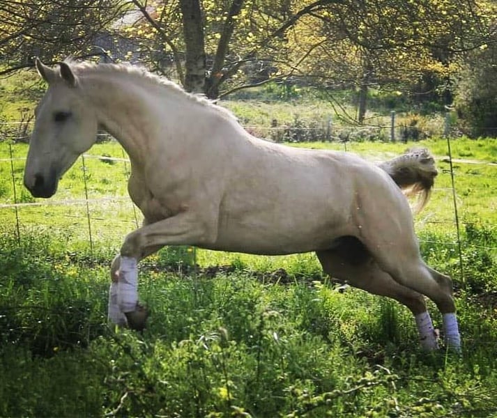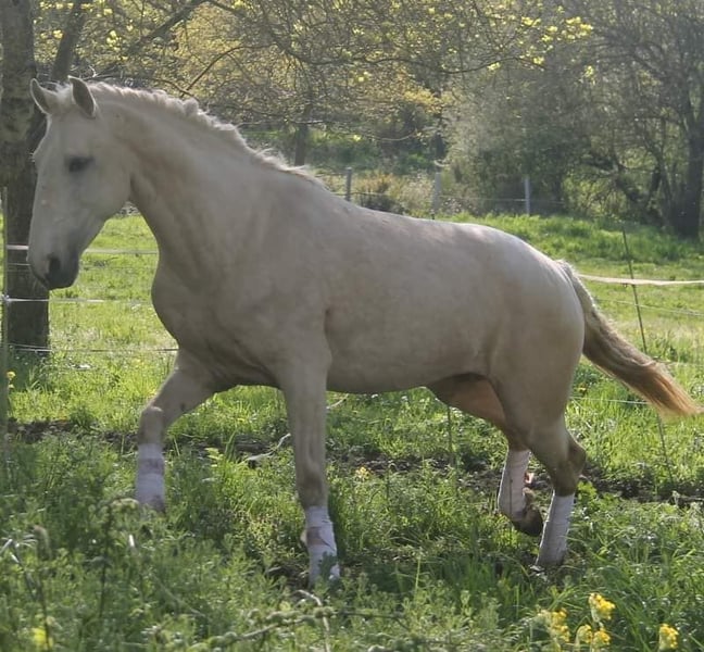Palma du moulin cassé Par salsa des Noues Et Pablo du chalet Palma du moulin cassé Très gentille pouliche disponible à la réservation pour le sevrage. Palma est née début mai dans notre petit élevage familial. Elle est de robe baie claire très fine et très brillante. Elle est manipulé régulièrement , elle adore les câlins, c’est un véritable pot de colle. Elle vit au pré avec sa mère et d’autres chevaux et poulains. Lors de la vente, elle saura marcher au licol, tenir à l’attache, donner ses pieds et voyager en van. Elle a déjà commencé ce travail. Palma est une pouliche très joueuse et très chic qui recherche l’homme. Elle fera le bonheur d’une personne désireuse de nouer une grande complicité. Elle nous montre de très bonnes aptitudes pour du dressage en liberté. Elle est vraiment très attachante. Possibilité de voir sur place son propre frère de 2 ans, sa mère et son père. Elle mesurera environ 1,58m Les parents ne sont pas approuvés, elle est donc de race Lusitanienne Origine Constatée Possibilité de rester en pension pâture Photos 7,8&9 : le père, Pablo du Chalet Photo 10 & 11: la mère Salsa des Noues Pouliche a voir absolument ! Autres renseignements par téléphone