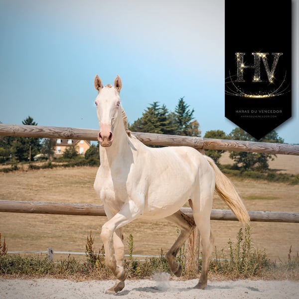 🤍 Addict du Vencedor 🤍 🇵🇹 Sired by Imperador (PSL) and out of Cachemire de Manolo (PSL) ✔️ Purebred Lusitano filly, perlino, born August 3, 2024 ✨️ Her strengths: The most prestigious Lusitano bloodlines, with the added bonus of her color! ■ Her sire, Imperador by Escorial (Olympic stallion), is also the father of our champion Rei, who won a silver medal at the 2024 Lusitano International Championship. ■ Her dam, Cachemire, born at the renowned "De Manolo" stud farm, is a daughter of the well-known Campeador CSM and was confirmed with an excellent score of 75.5 points. Addict is a double cream and will be a valuable addition for breeding or sport. She will have size and type, and as a cherry on top, Addict embodies kindness!